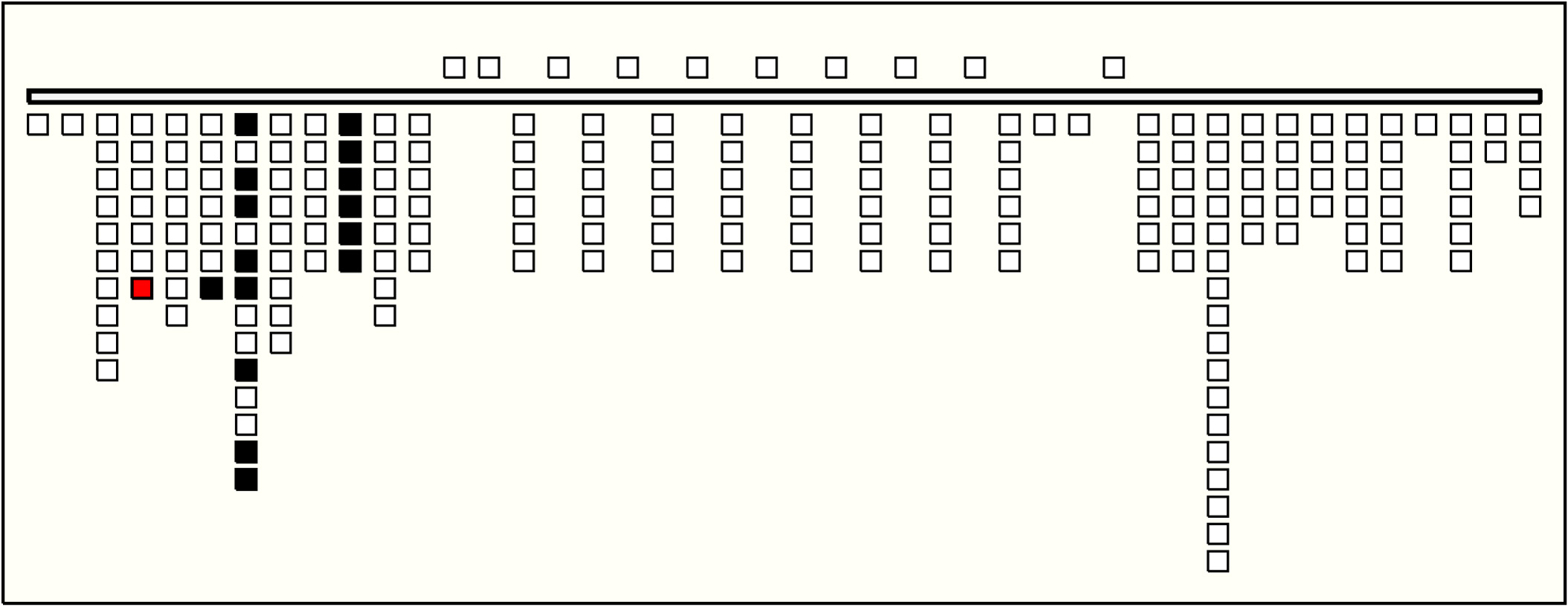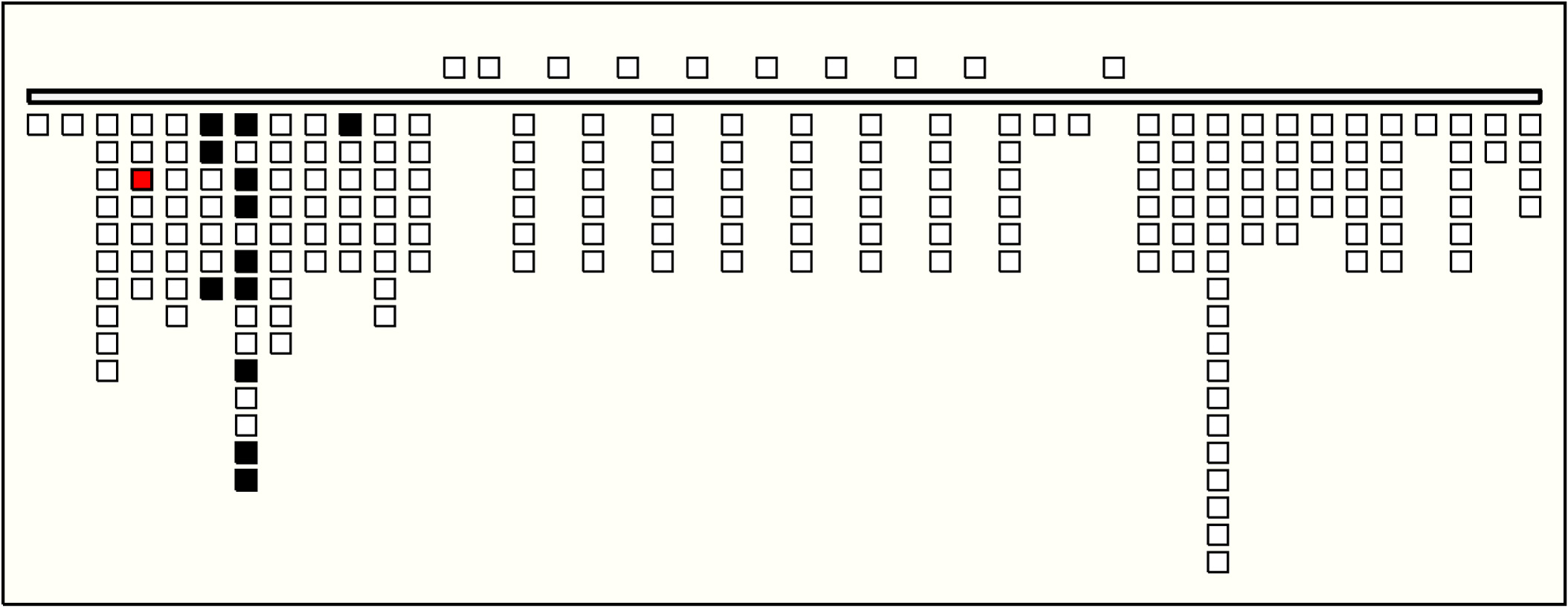 - The values on Groups 2 to 10 are quite similar. On all, position 1 has value 1; position 2 is zero-valued; position 3 has value 0, 1, or 2; position 4 has value 9; position 5 is zero-valued; and position 6 has value 0, 1, 2, or 3. The third position is the only one with subsidiaries. In each group it has 1 or 2 subsidiaries, one or none of color CB (values unknown as always broken ), and one of YB or MB (values 0, 1, or 2). Group 1 sums Groups 2-10. The summation is exact in 5 of the 6 pendant positions and off by 2 in position 4. It is also exact on one of the subsidiary positions and, due to breakage, unknown on the other. So: