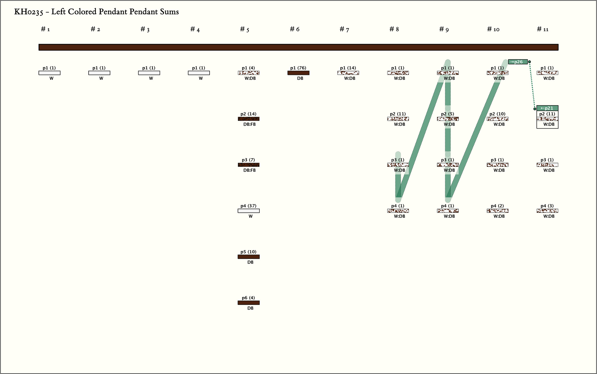 - The subsidiaries on the top cord probably sum the subsidiaries on the pendant cords but three values are in doubt due to breakage. The two W subsidiaries on the second pendant sum to at least 10 and another on the fourth pendant has value 2. A DB subsidiary on the third pendant has value 3 and an FB subsidiary on the fourth pendant is broken. These can be associated respectively with the following top cord subsidiaries: a W with value 13, a U with value 2, and a DB with value 4.