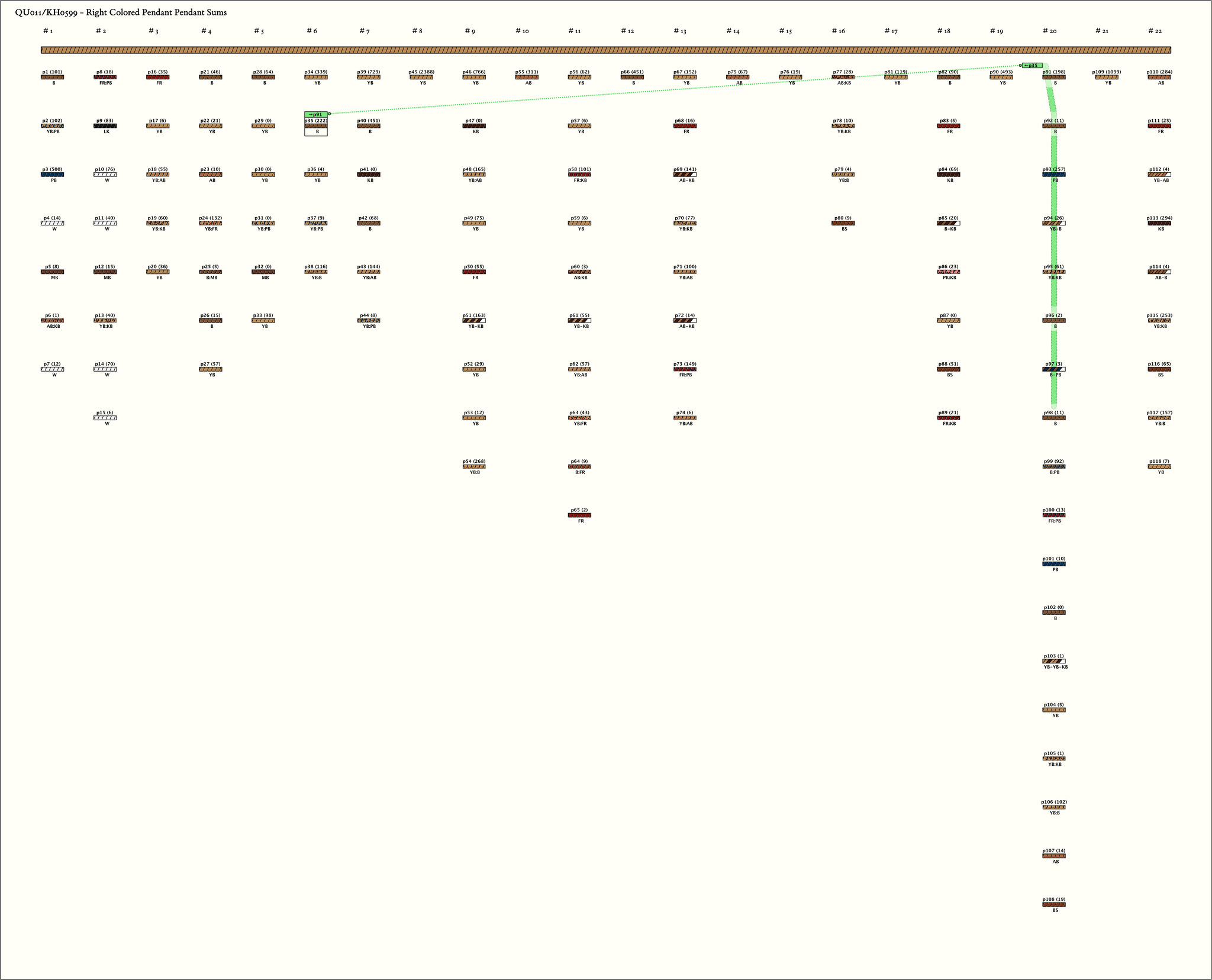 Decimal hierarchy and registers of knots are not followed, therefore knots listed by 1st, 2nd, 3rd on a single string and cord value totals not calculated (when a group seems to follow a register, those knots are kept in the same column as others in their register).