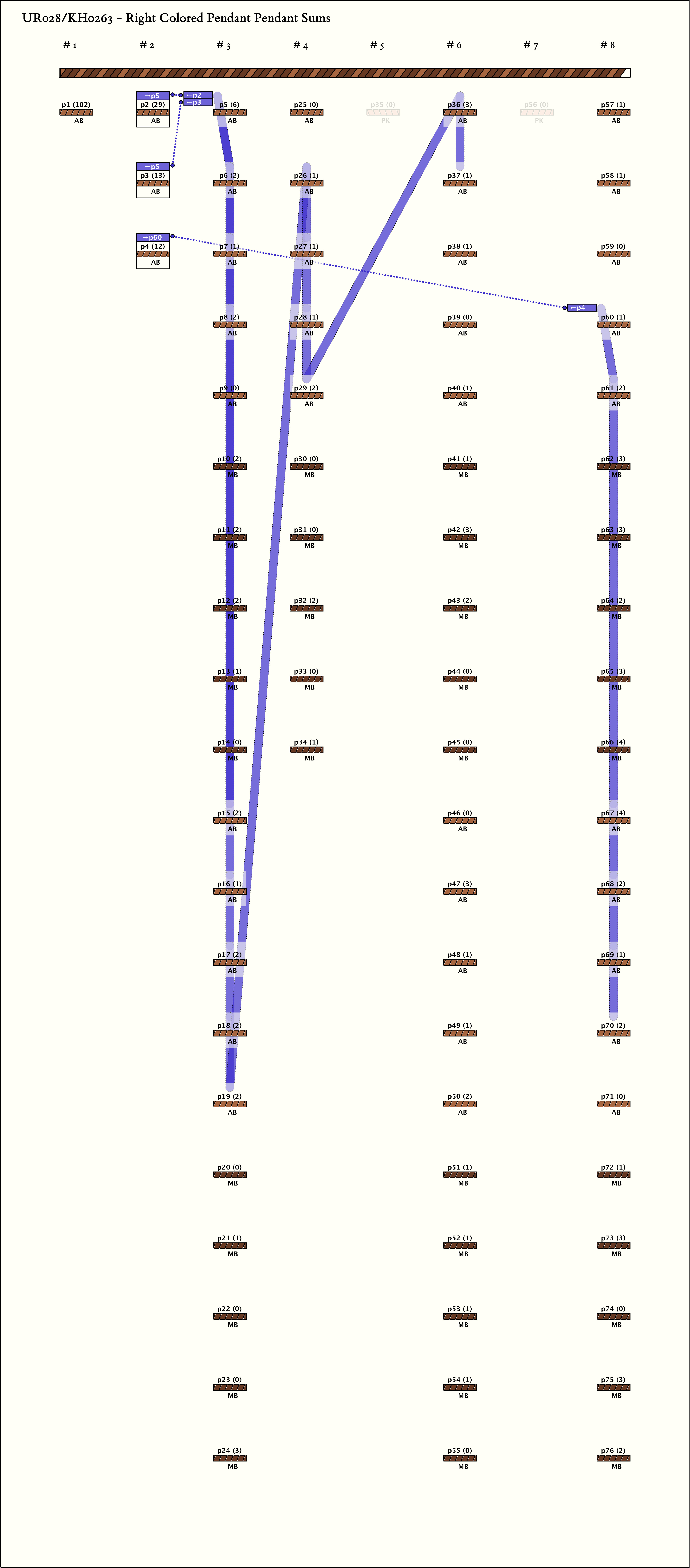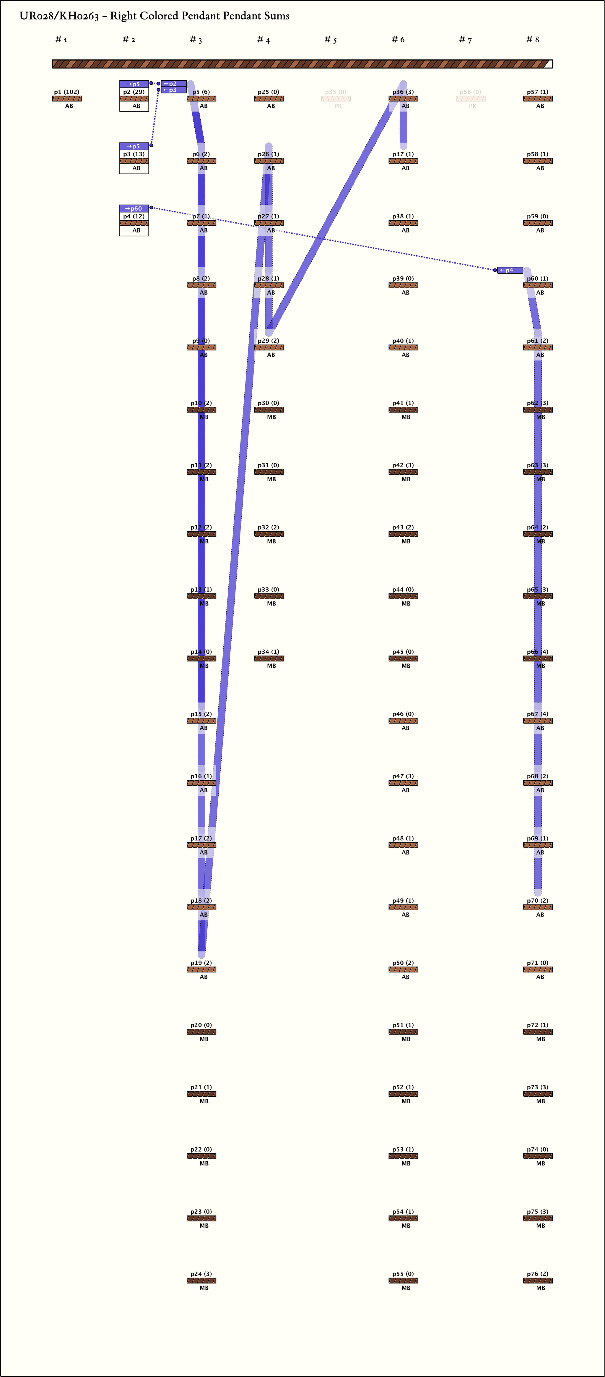 Cord p1 is the sum of p2-p4 including subsidiaries. Cord p5-p74 are grouped into various five-cord sets. Cluster 3,6, and 8 have 20 cords - 4 color-banded sets of 5 cords, alternating between MB (Moderate-Brown) and AB (Light-Brown). Cluster 4 is similar, with 2 alternate colored, color-banded, sets of 5 cords.
