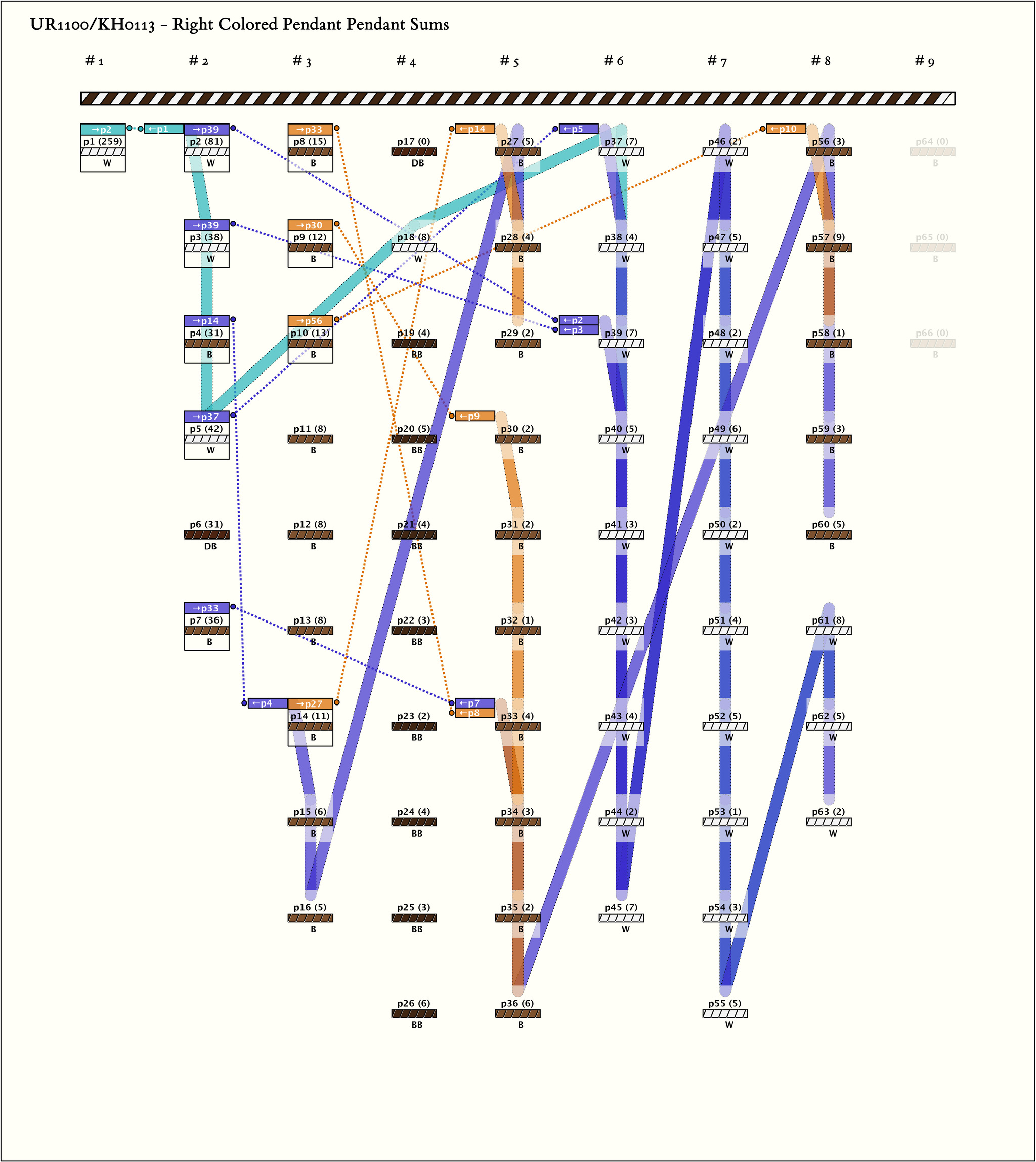 - By spacing, the khipu is separated into 3 parts. A single cord dangles from the end of the main cord, then part 1 is 1 group of 6 pendants, part 2 is 6 groups of 8-10 pendants each, and part 3 is 1 group of 3 pendants. Each pendant in part 1 has one subsidiary which is DB.