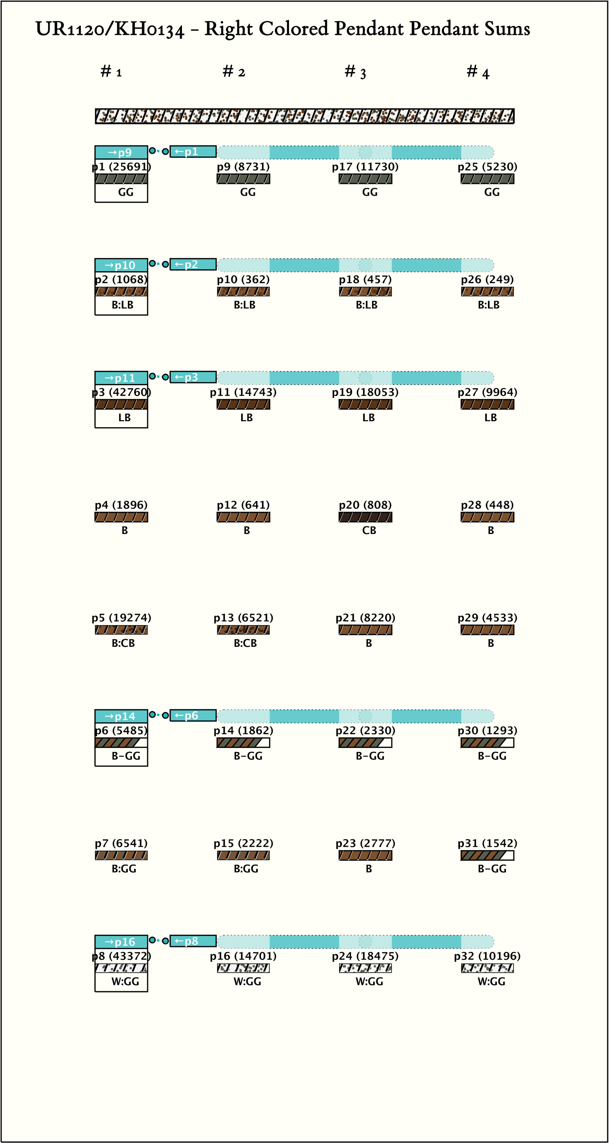 - By spacing, the khipu is separated into 4 groups of 8 pendants each. The color pattern for each group is the same (with the minor exception that pendants 7 and 8 in group 4 are B:GG and B/B-GG rather than the B-GG and B/B:GG of similar positions). In each group, there is one subsidiary on position 3 and it is the color of the pendant to which it is attached.