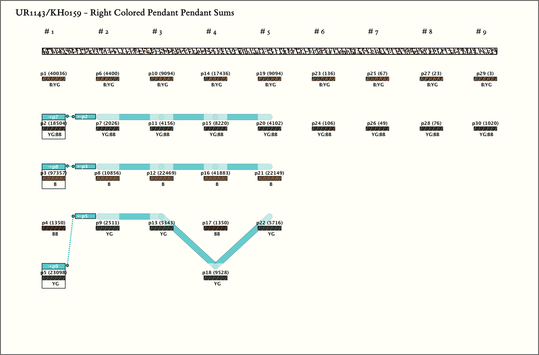 - Each group has the same 5-color pattern: B:YG, BB:YG, B, BB,YG. Where there are only 4 pendants, it is the 4th position that is non-existent.