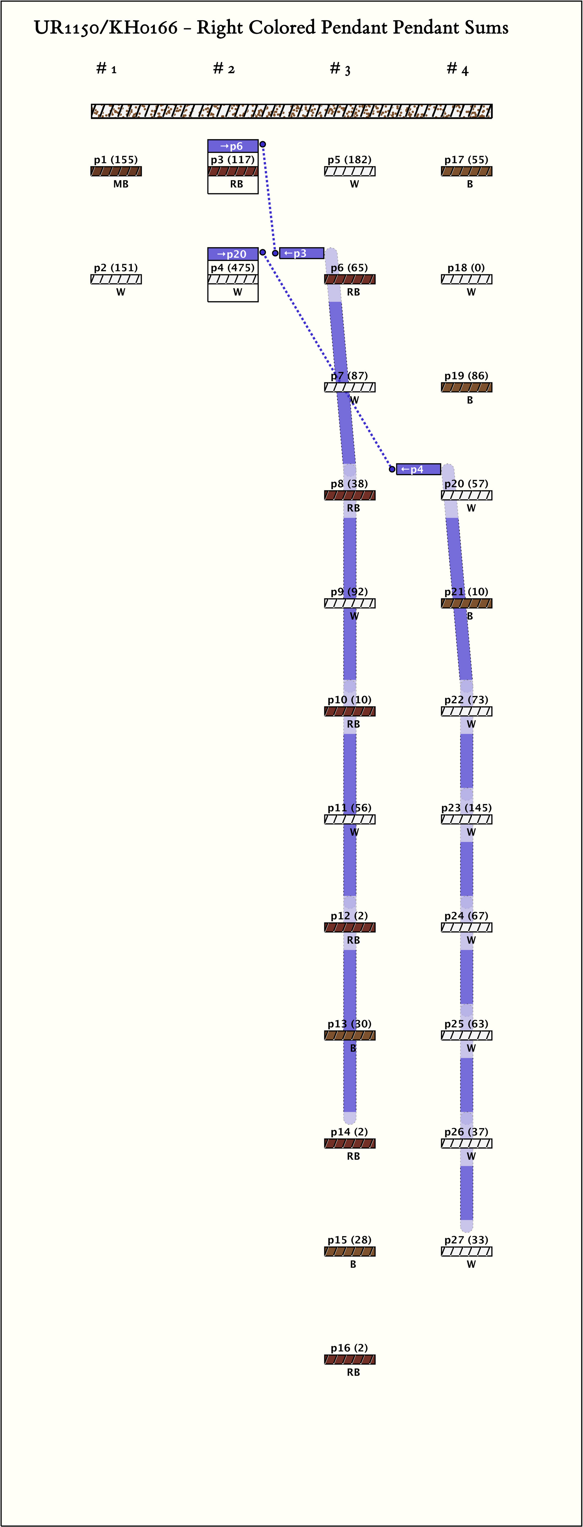 - By spacing, the khipu is separated into 4 groups of 2, 2, 12, and 11 pendants each. In the 3rd group, the pendant colors alternate W or B, RB; in the 4th group, they alternate B, W, for 3 pairs and then are all W. There are no subsidiaries in the 3rd group, and in the 4th group, there are 2 subsidiary positions. Where there is one subsidiary in the higher position, it is RB; where there are 2, they are RB, MB. Each subsidiary in the lower position is LB.