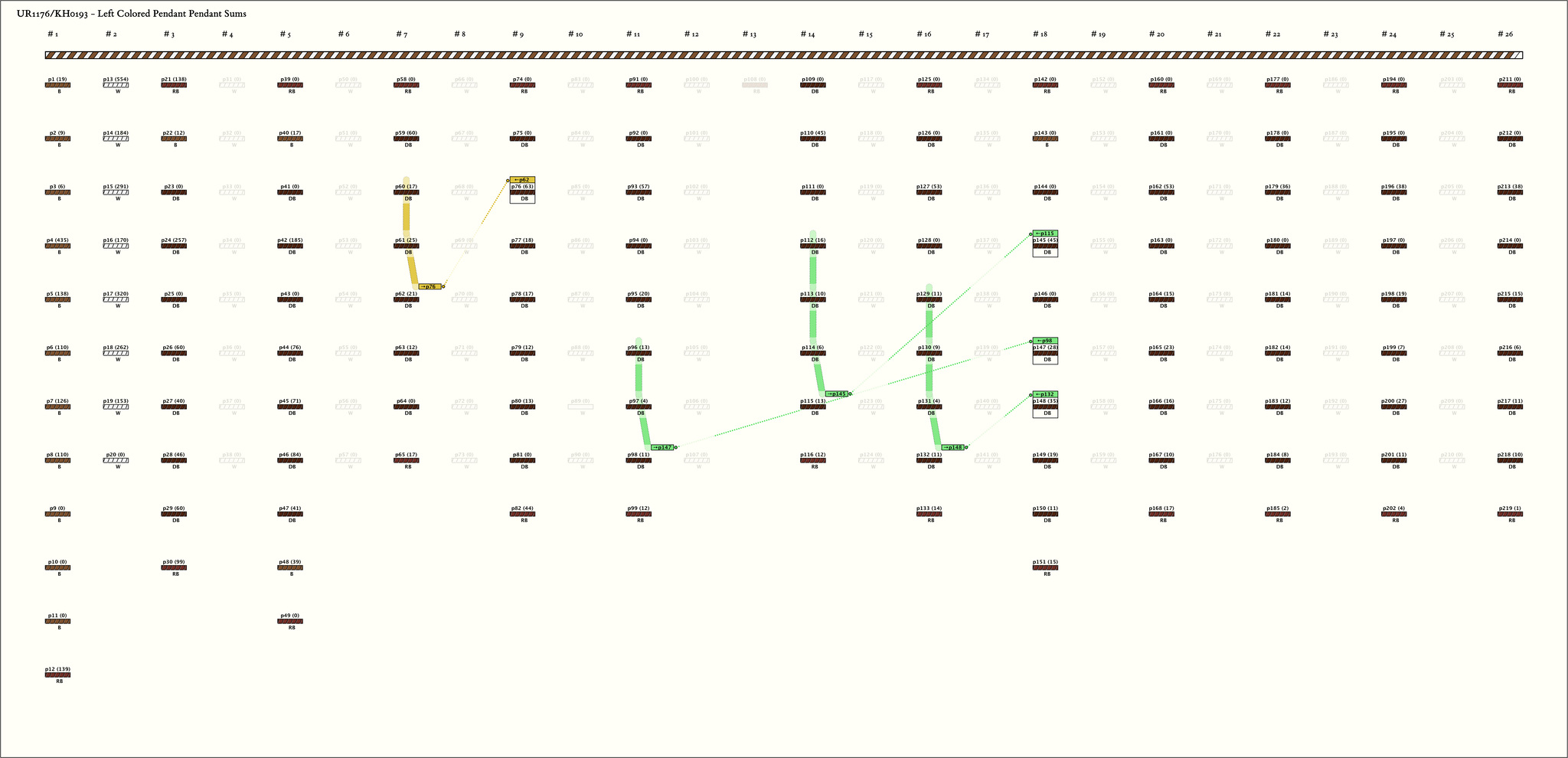 - By color, the khipu is separated in 25 groups. The first group is 12 pendants. Then there are 24 groups alternating in color pattern. Basically the pattern is a group of 8 pendants color W, followed by a group of 9 pendants colored RB, 7 DB, RB. (The exceptions t o the pattern are: groups 3, 5, and 17 each have an additional pendant between positions 1 and 2; groups 5, 7, and 9 each have an additional pendant between positions 8 and 9; in groups 7 and 9, position 4 is non-existent; and in group 7, position 2 is also non-existent. ) Starting with group 4, all groups of W pendants are of value 0 (or blank) and, in the alternate groups, all values in positions 1, 2, and 4 are 0 (or blank).