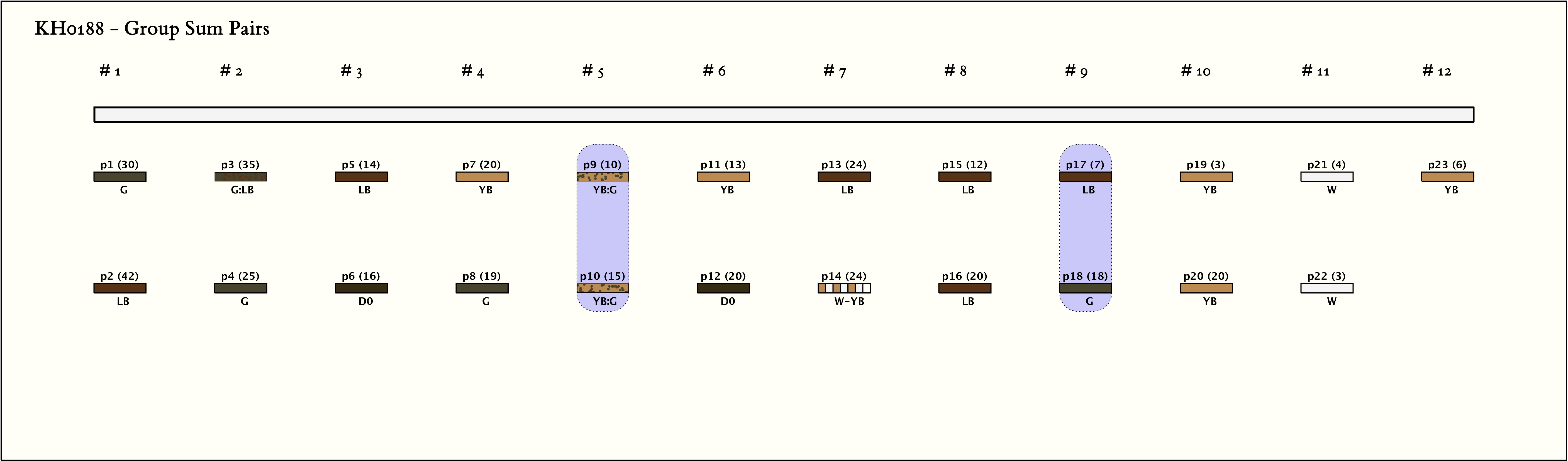 - By spacing, the khipu is separated into 11 groups of 2 pendants each and then 1 single pendant. In only 4 of the groups are both pendants the same color. All values are between 3 and 42.