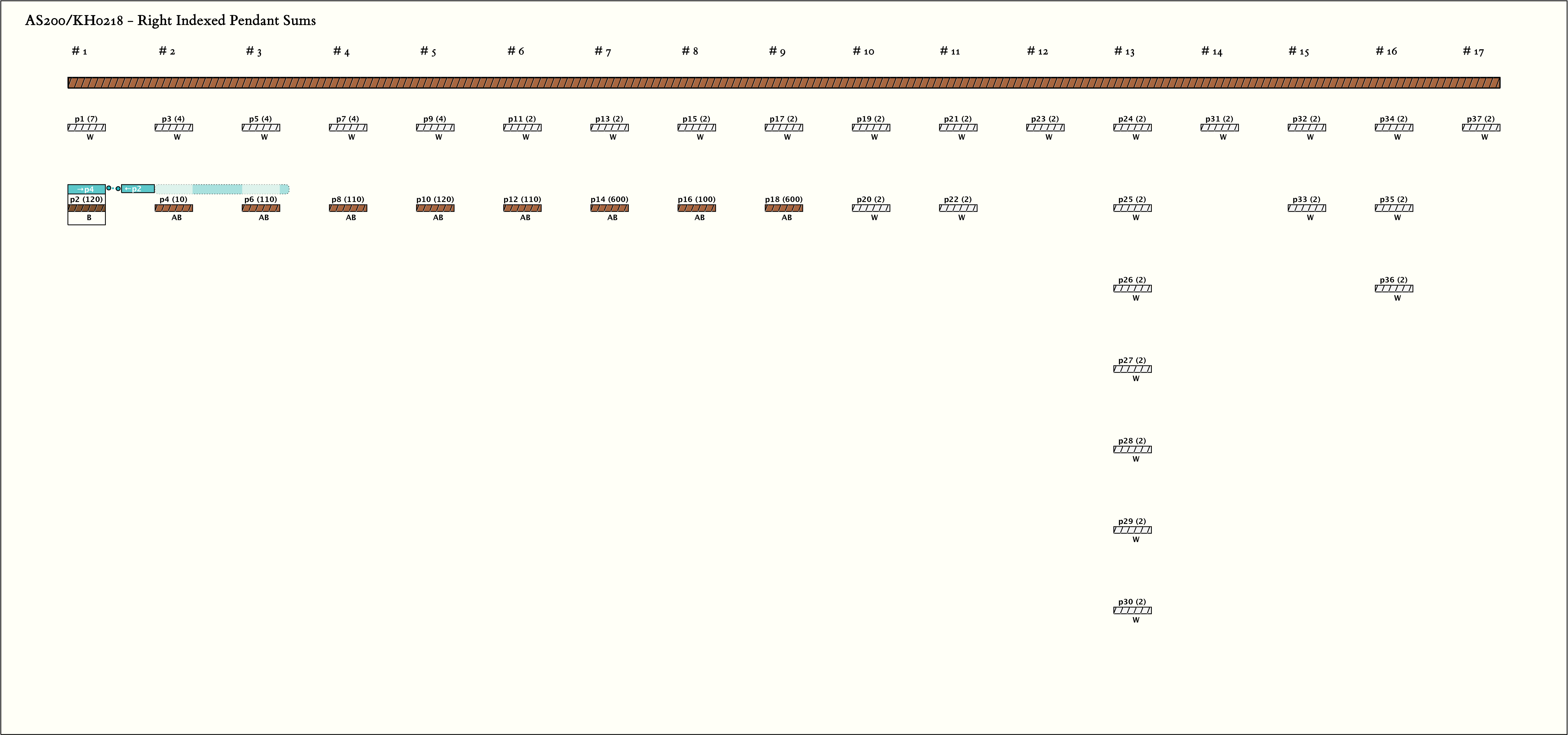 - The second part is 19 pendants all color W, each with value 2, and each with a B colored subsidiary. The subsidiary values include one 13 and the rest are multiples of 10 from 40-80.