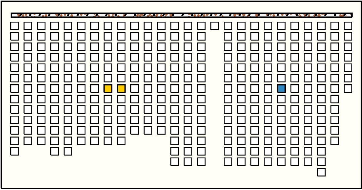 - By spacing, the khipu is separated into 25 groups but ends with a break in the main cord at the middle of the 25th group. A marker on the main cord separates the first 15 groups from the last 10 groups.