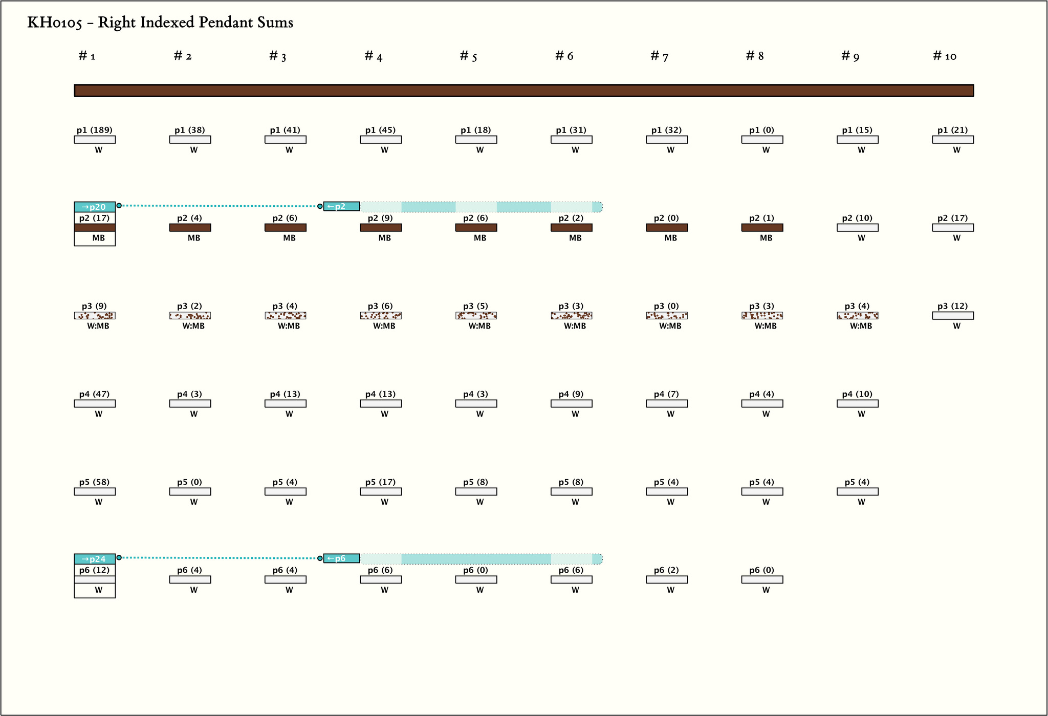 - By spacing, KH0105 is separated into 10 groups. The first 8 groups each have 6 pendants with the same color pattern (W, MB, MB:W, W, W, W).