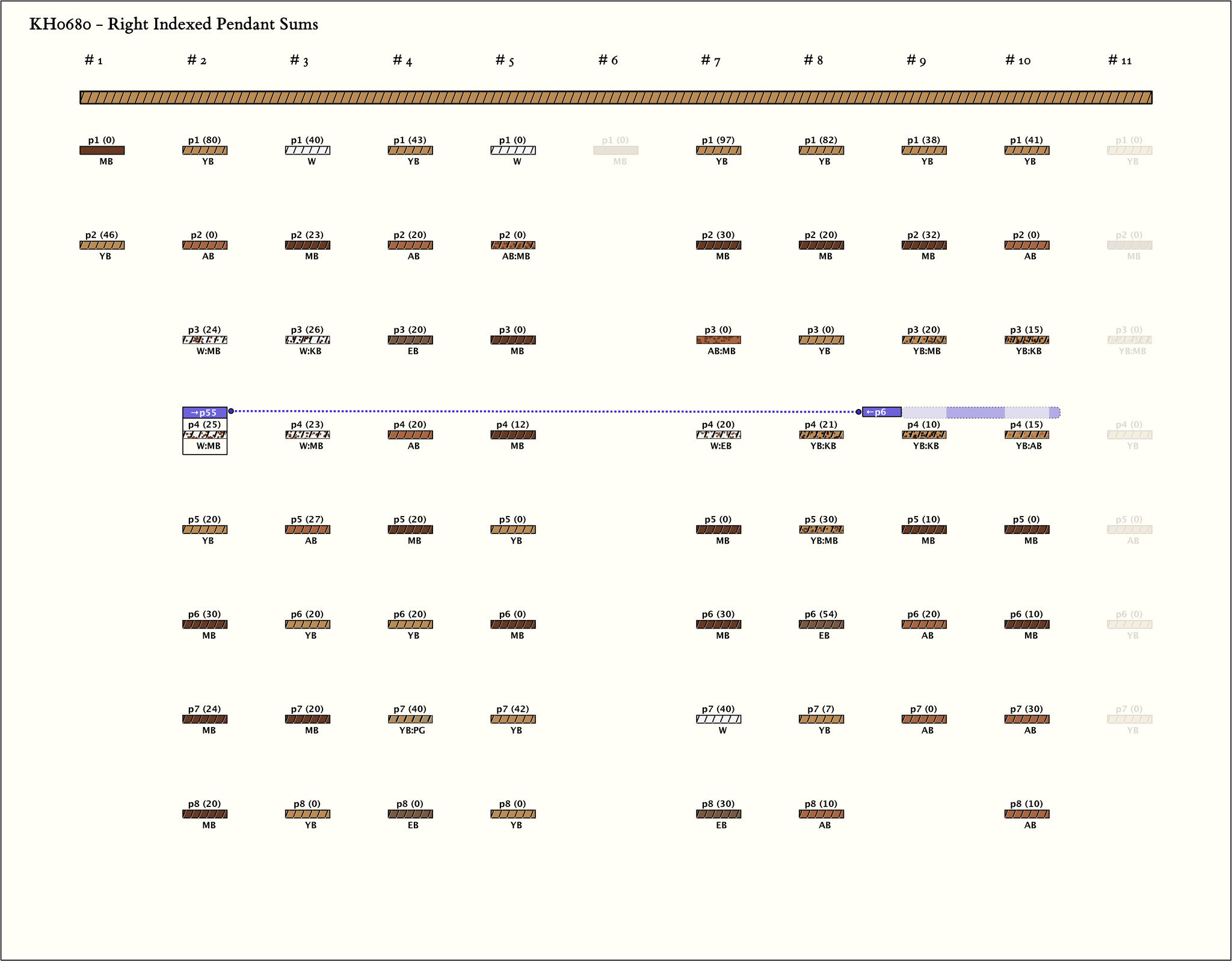 Museum Description: One of four khipus in the museum collections (three of which are on display). Displayed flat in the exhibit, in same configuration over the past several decades (lying ~flat, slight angle for viewing in waist-high glass display case in the "Kulturen der Welt" exhibit on the third (top) floor of the museum). Mounted on a cloth board with KH0680 (Gaffron collection). The khipu has a medium-thickness, solid-color primary cord. A fully detached piece of the primary cord's dangling end is displayed above the pendant section of the primary cord. An additional fragment of the primary cord is attached to the backing board near the top right corner of mounting. It appears that the portion of primary cord with associated pendants is fully preserved (as the detached section of primary cord does not have any associated pendants).
