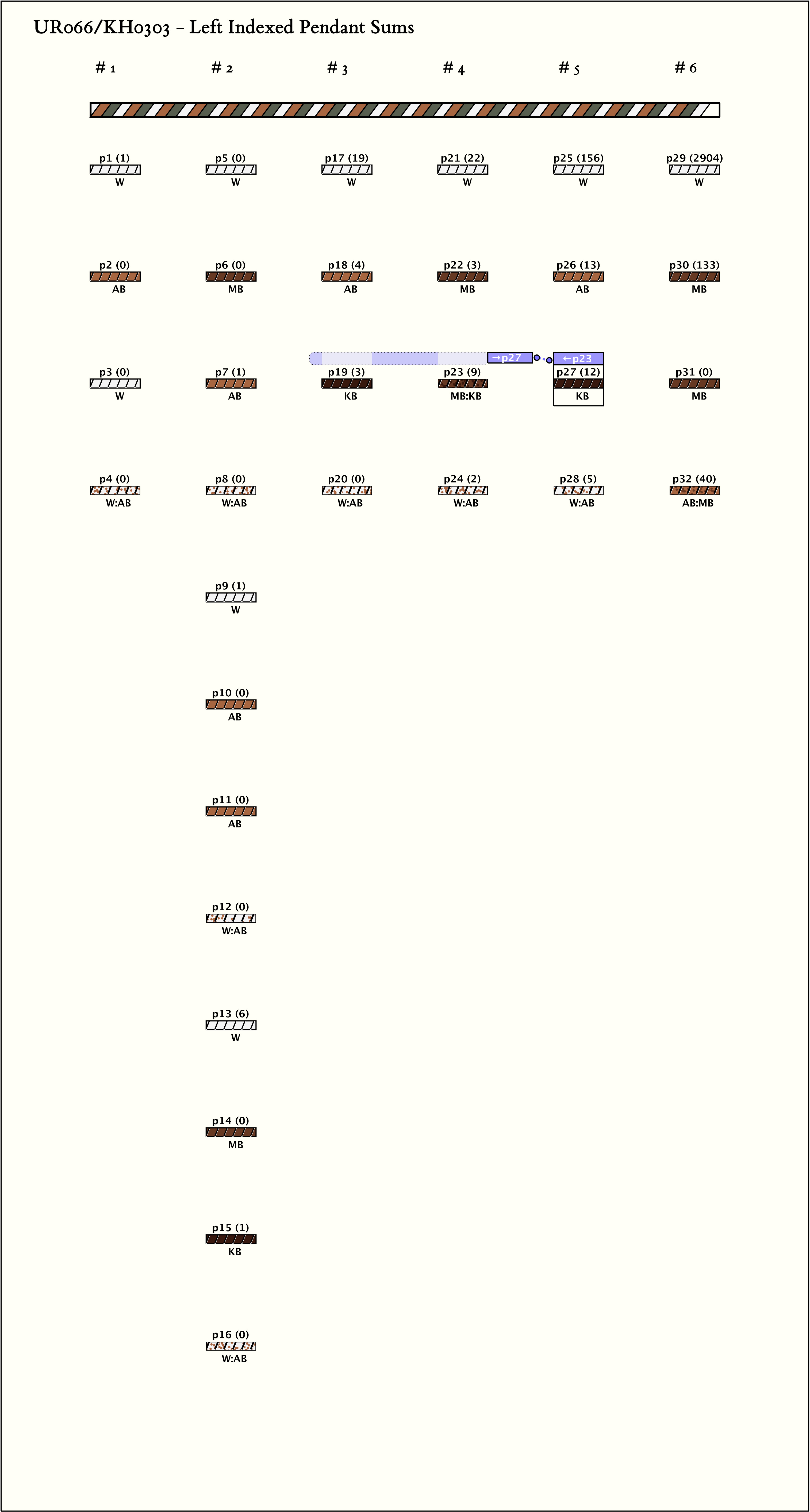 UR66 was rolled together with UR67. Pendants facing away, khipus unroll so that doubled end of primary cords are on the left; 66 is on top. Roll up left to right, S spiral.