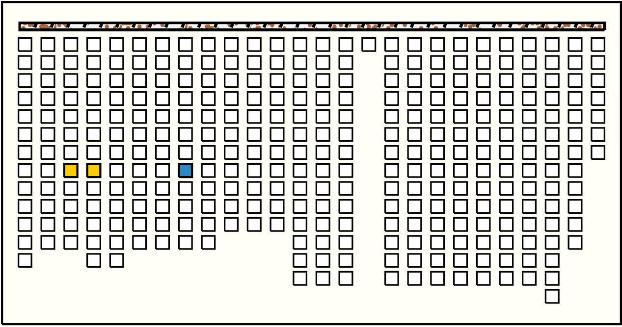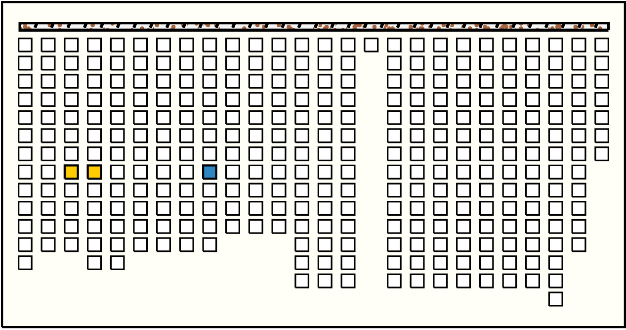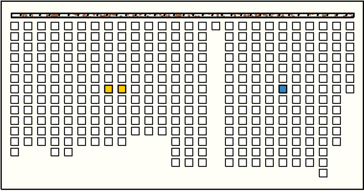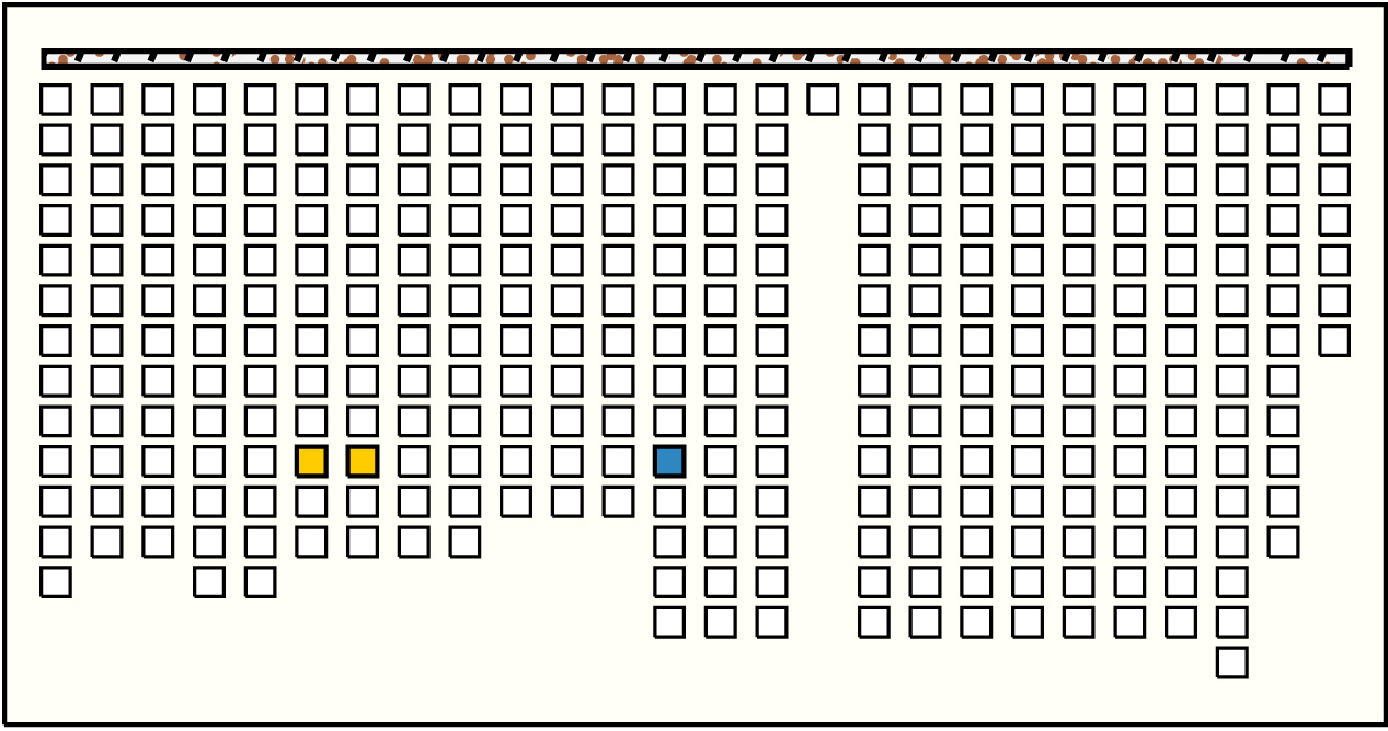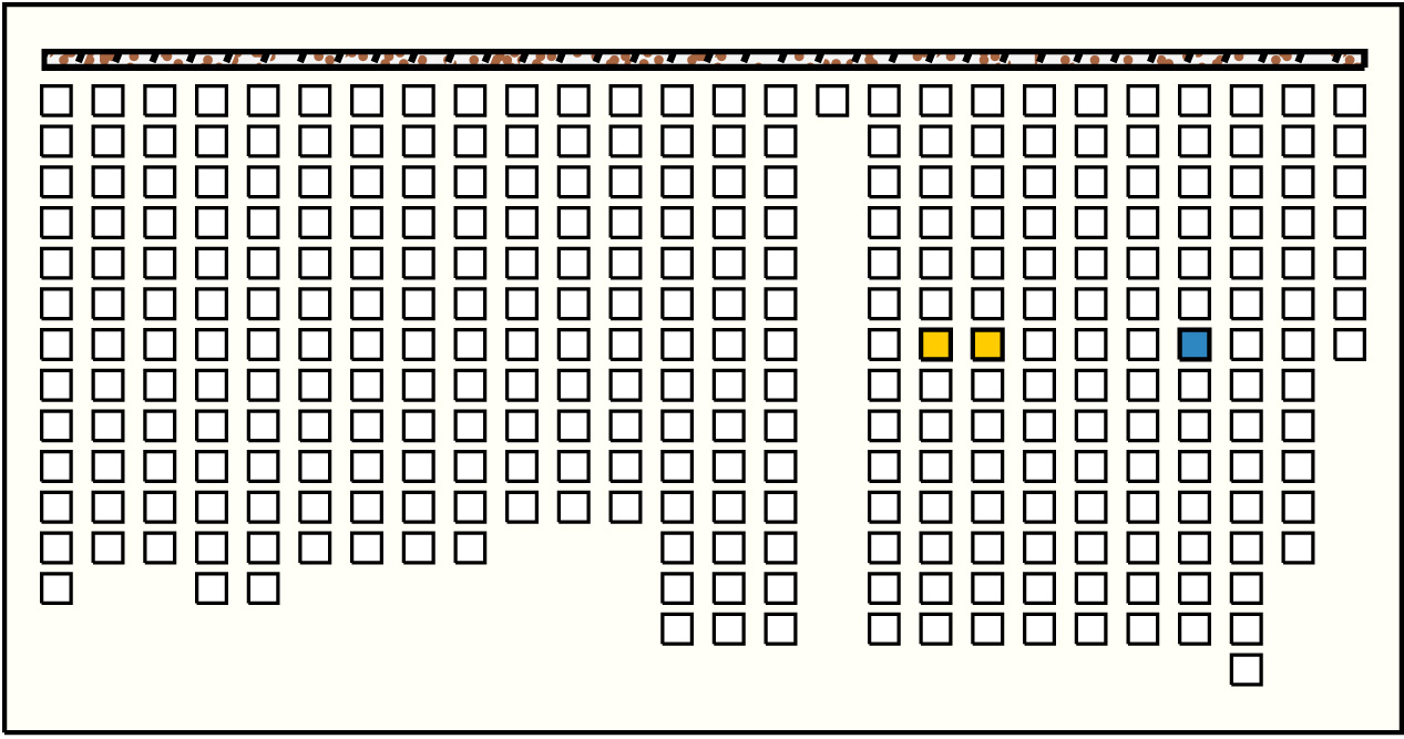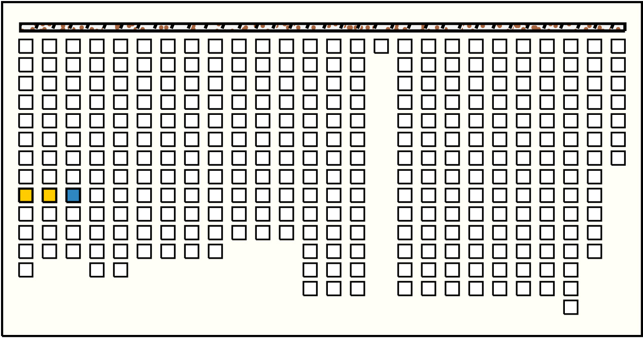 - By spacing, the khipu is separated into 25 groups but ends with a break in the main cord at the middle of the 25th group. A marker on the main cord separates the first 15 groups from the last 10 groups.