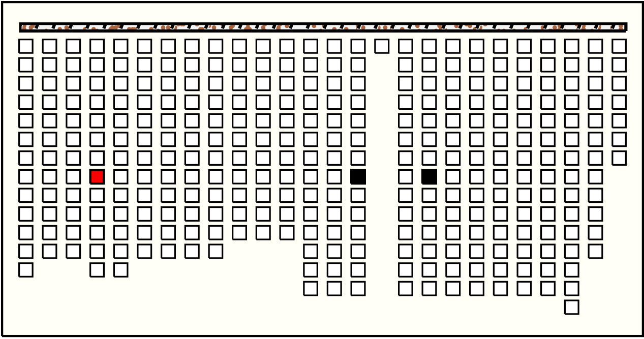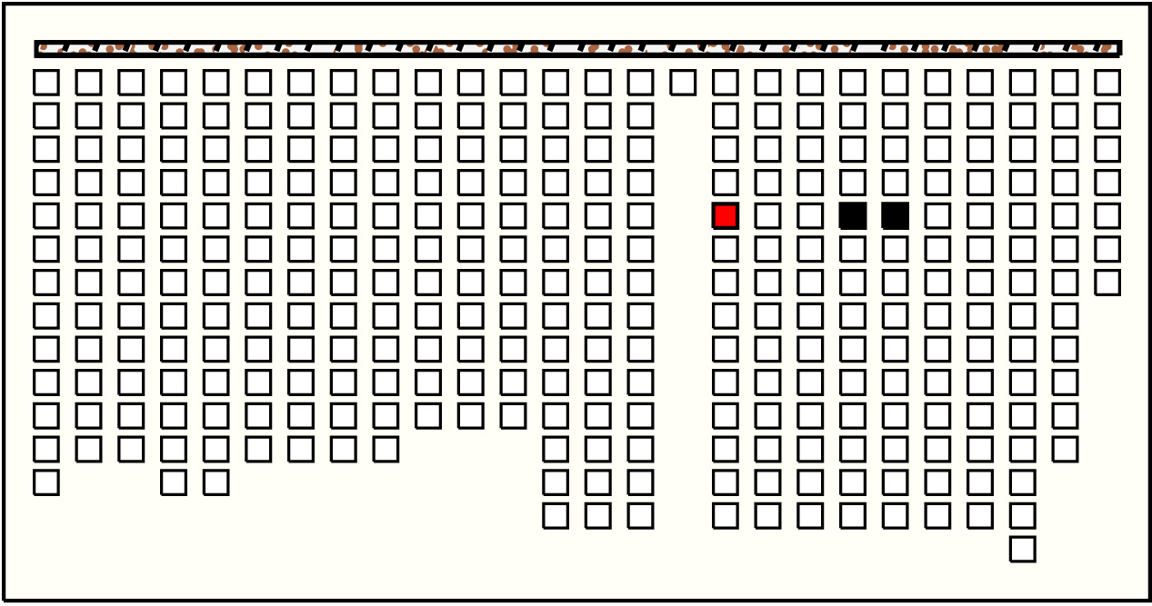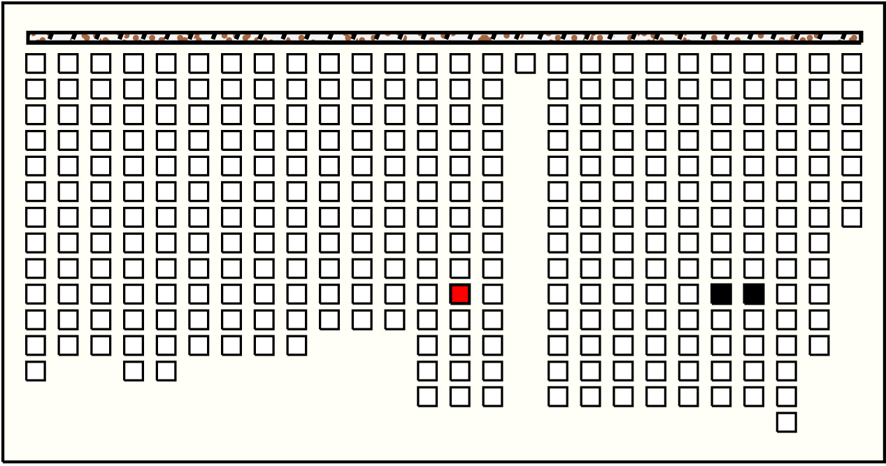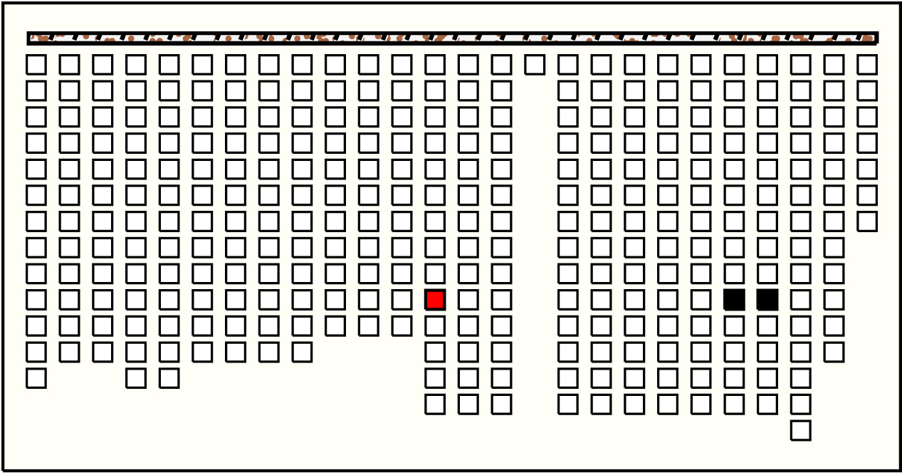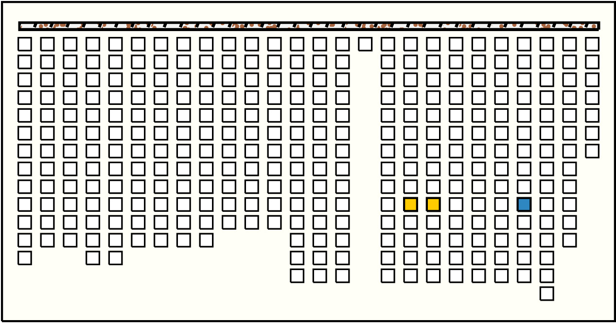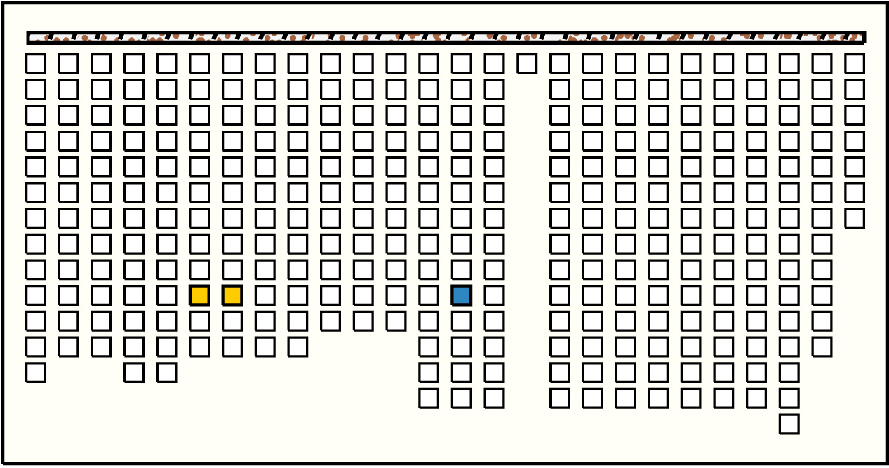 - By spacing, the khipu is separated into 25 groups but ends with a break in the main cord at the middle of the 25th group. A marker on the main cord separates the first 15 groups from the last 10 groups.