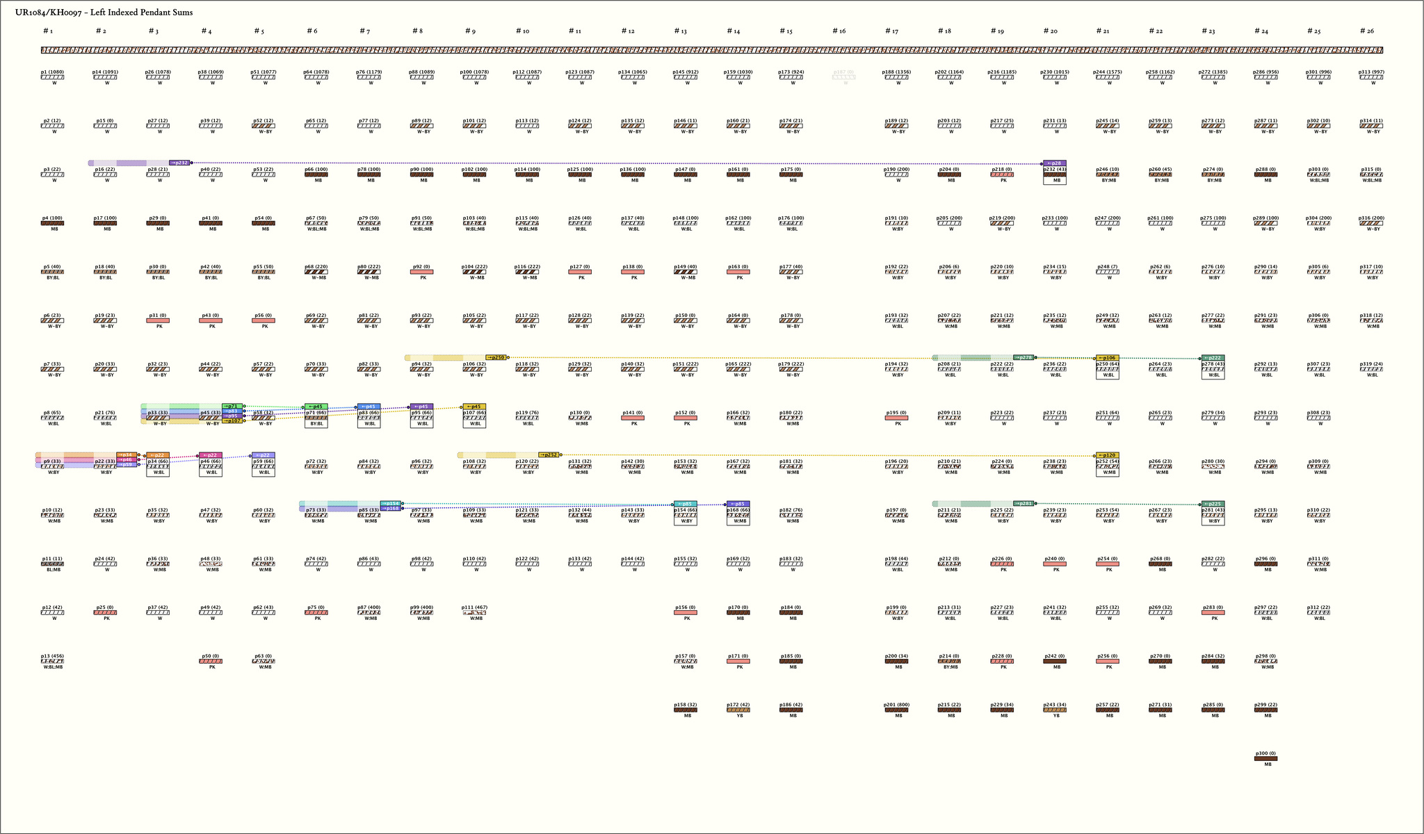 - At first glance, the groups seem to vary in size and color pattern. However, when viewed as groups of 15 pendants with some positions non-existent in each group, the colors and values are repetitions. The 25 groups of 15 pendants have been arranged in a rectangular table (see Table 1). A blank means the position is non-existent, an M is a missing pendant, and a ? indicates that the pendant is broken so the value is unknown. An unequal sign ≠has been used to mark a change in color. Where there is no color change, but just a color anomaly, the value has been grouped with parentheses i.e. (39). Observe from the table that although similarities remain, there are decided differences between part 1 (groups 1-15) and part 2 (groups 16-26). Also, within part 1, there are several changes after the 5th group and after the 12th group.