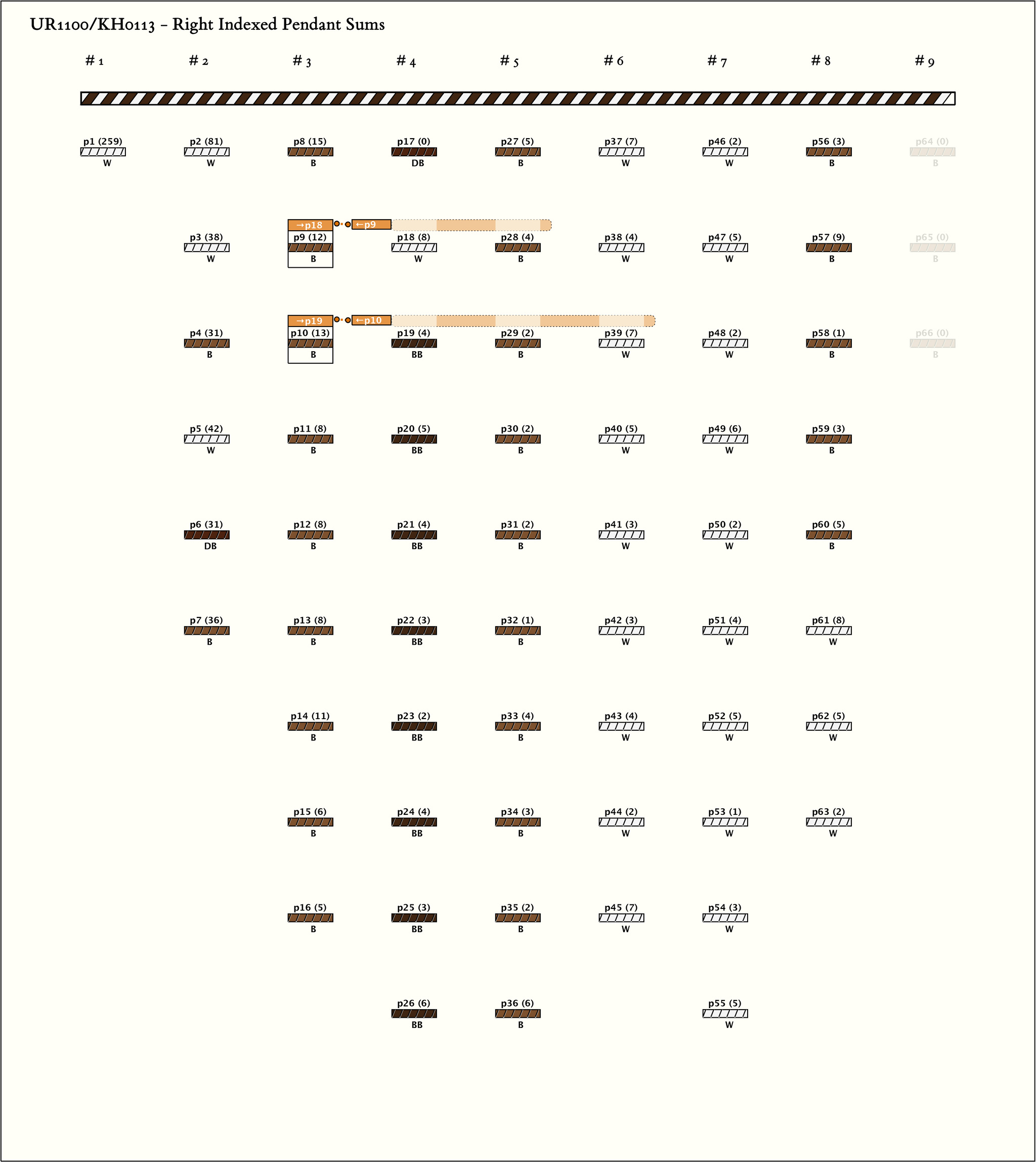 - By spacing, the khipu is separated into 3 parts. A single cord dangles from the end of the main cord, then part 1 is 1 group of 6 pendants, part 2 is 6 groups of 8-10 pendants each, and part 3 is 1 group of 3 pendants. Each pendant in part 1 has one subsidiary which is DB.