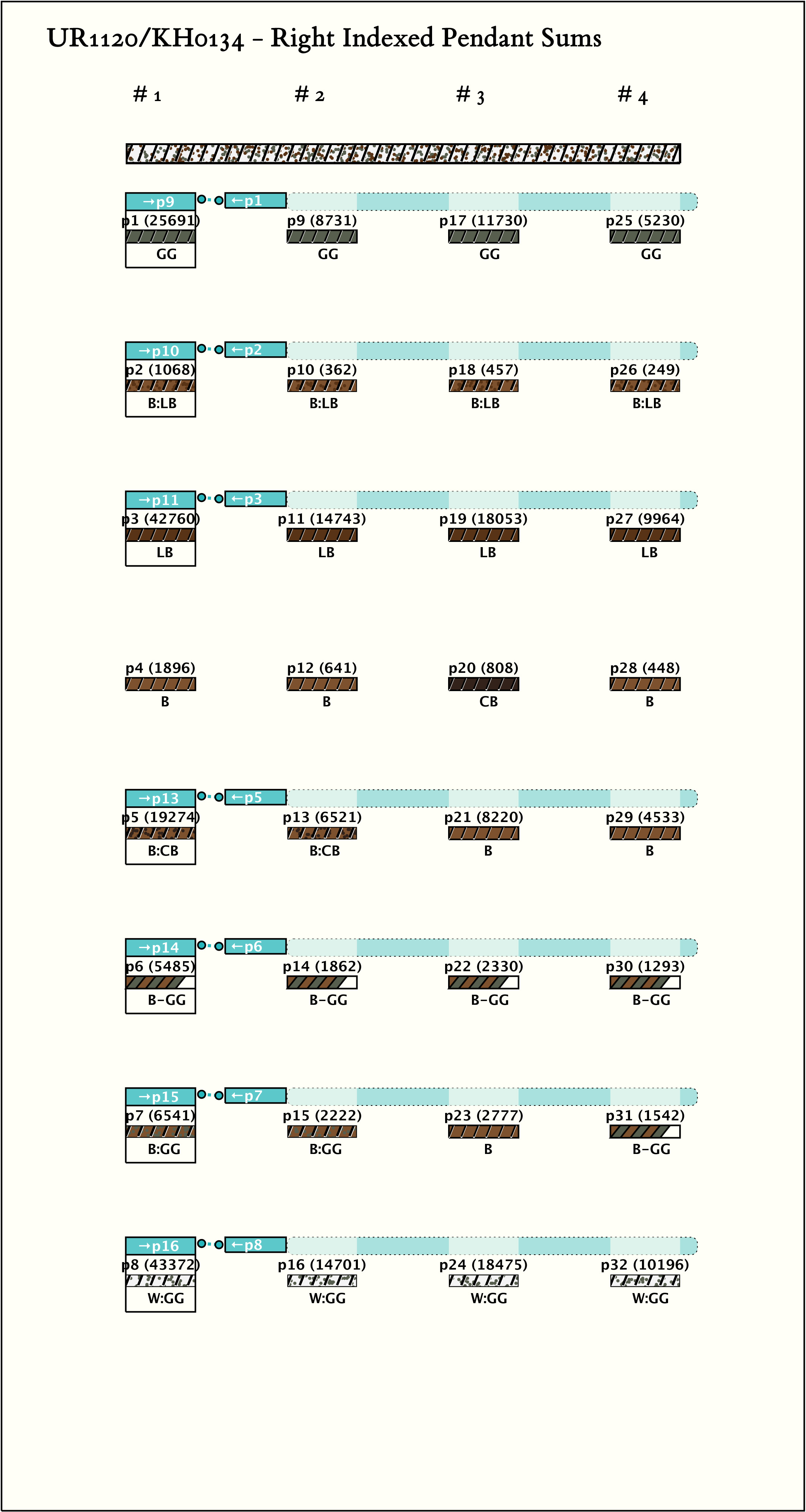 - By spacing, the khipu is separated into 4 groups of 8 pendants each. The color pattern for each group is the same (with the minor exception that pendants 7 and 8 in group 4 are B:GG and B/B-GG rather than the B-GG and B/B:GG of similar positions). In each group, there is one subsidiary on position 3 and it is the color of the pendant to which it is attached.