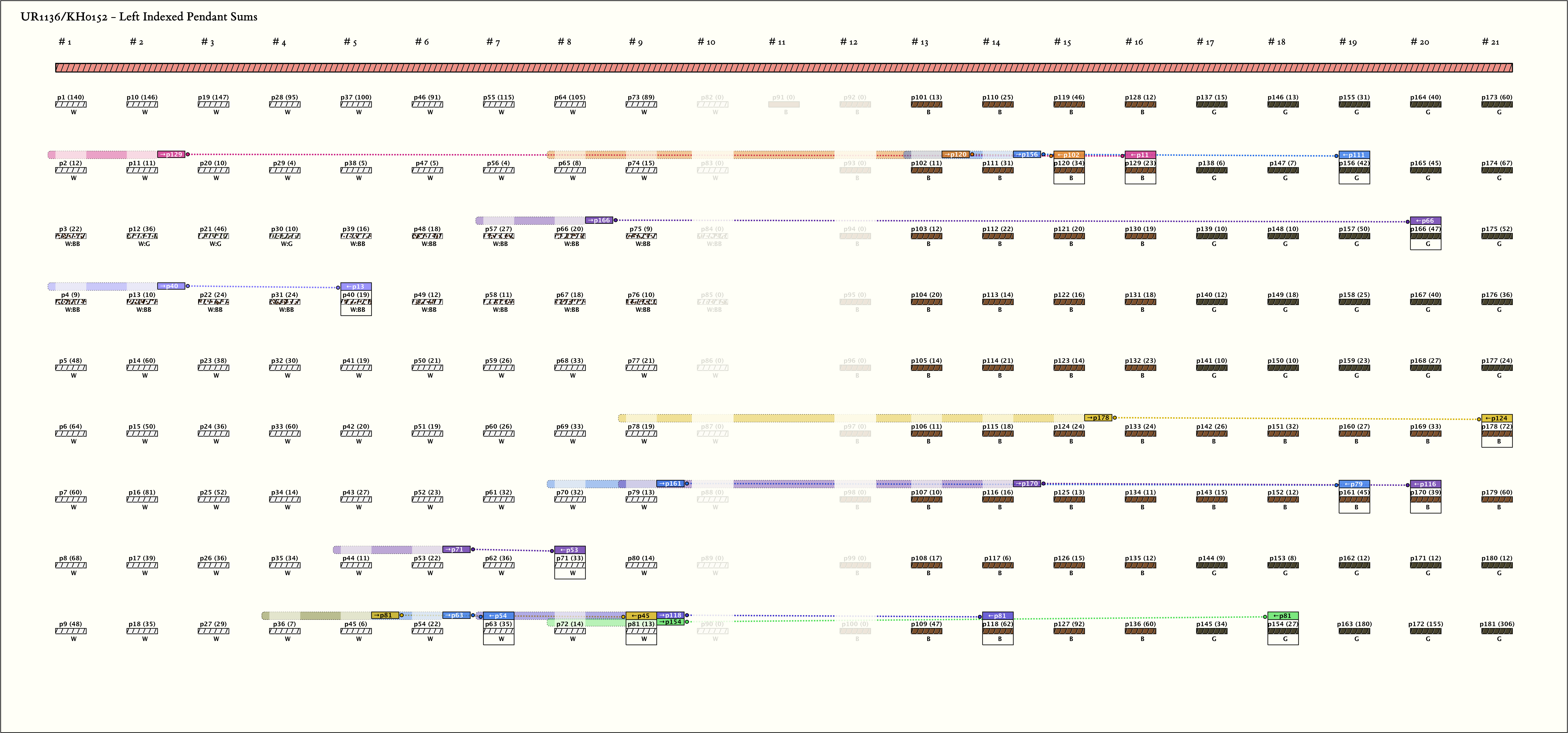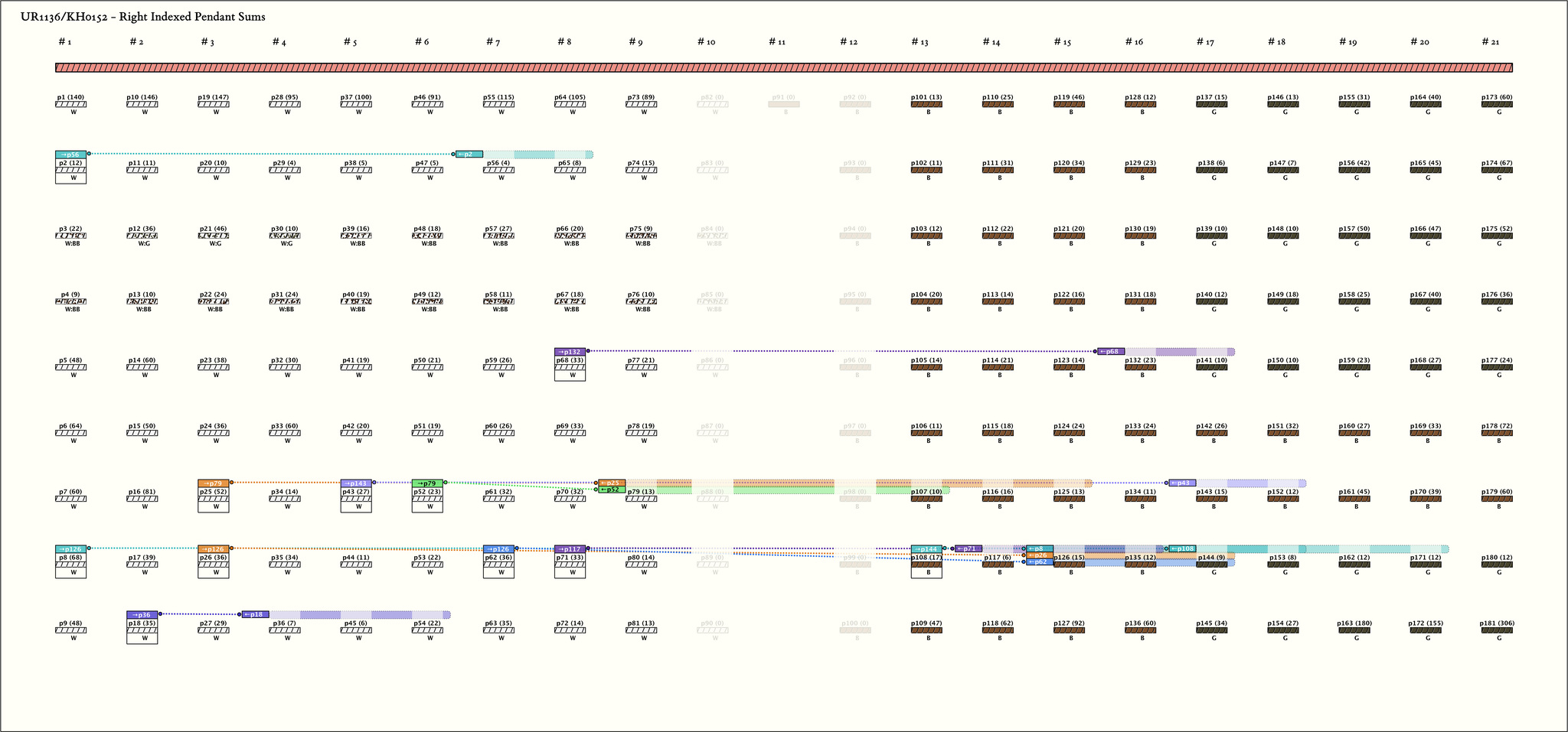 - The khipus can be oriented so that they have a common color pattern. The pattern separates the 9 pendants in a group into 2, 2, and 5 pendants with the first 2 and last 5 being the same color. In 5 of the groups of UR1136, the remaining 2 pendants are also the same color. But, in most of the other groups, those 2 pendants are the same color as each other but different from the rest of the group.