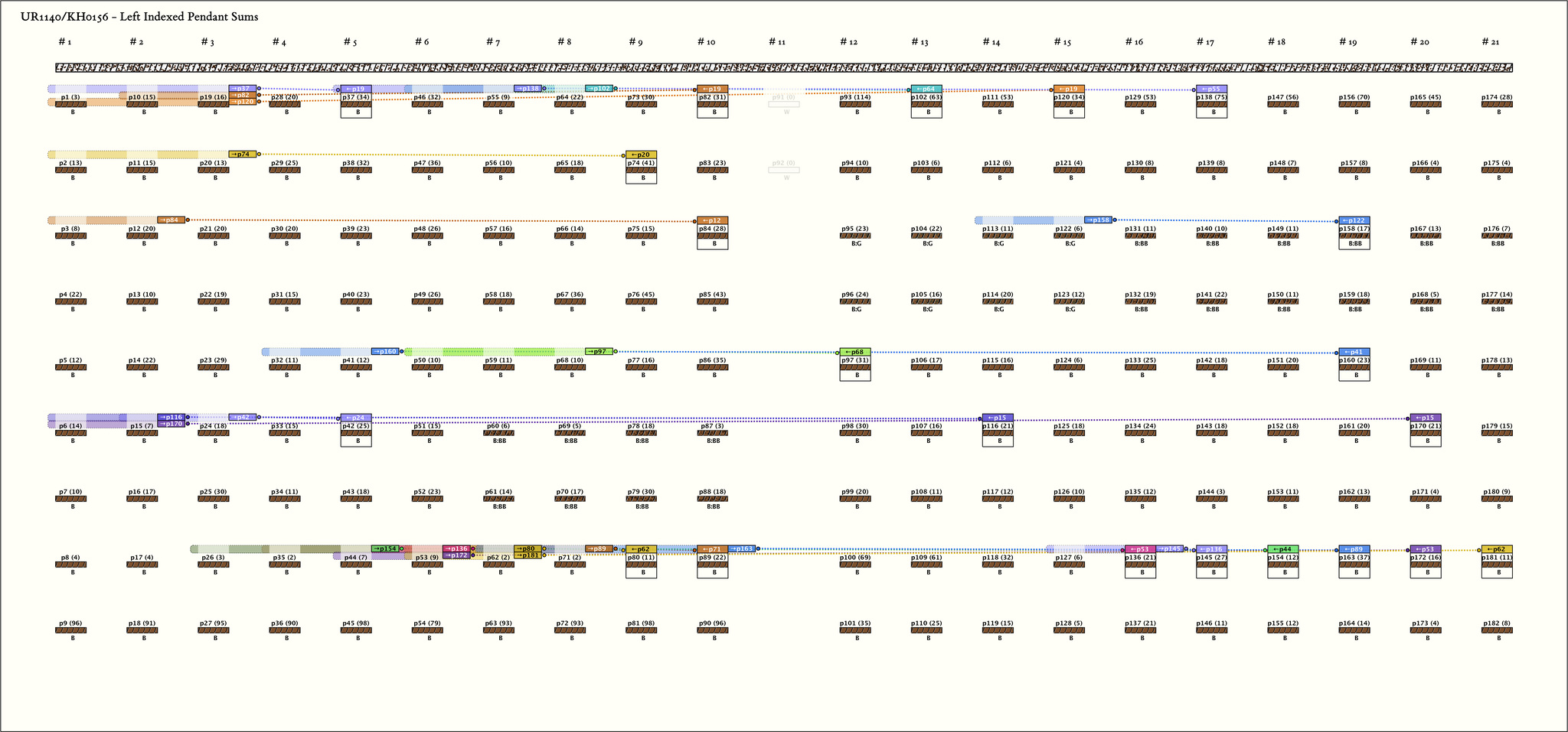 Note: The pendant order on the listing proceeds from one end of the bar to the other, goes around the end, and continues on the other side. However, similar color and number patterns are found in both parts if the pendants are read instead from one end of the bar to the other, and then beginning at the original end on the other side of the bar. We will, therefore, refer to the pendants and groups on side 2 as if following the second scenario. Part 1 is pendants 1--->90 and references to the jth pendant in the ith group correspond to pendant 9 (i-1) +j. Part 2 is pendants 180--->91 and references to the jth pendant in the ith group correspond to pendant 190-9i-j.