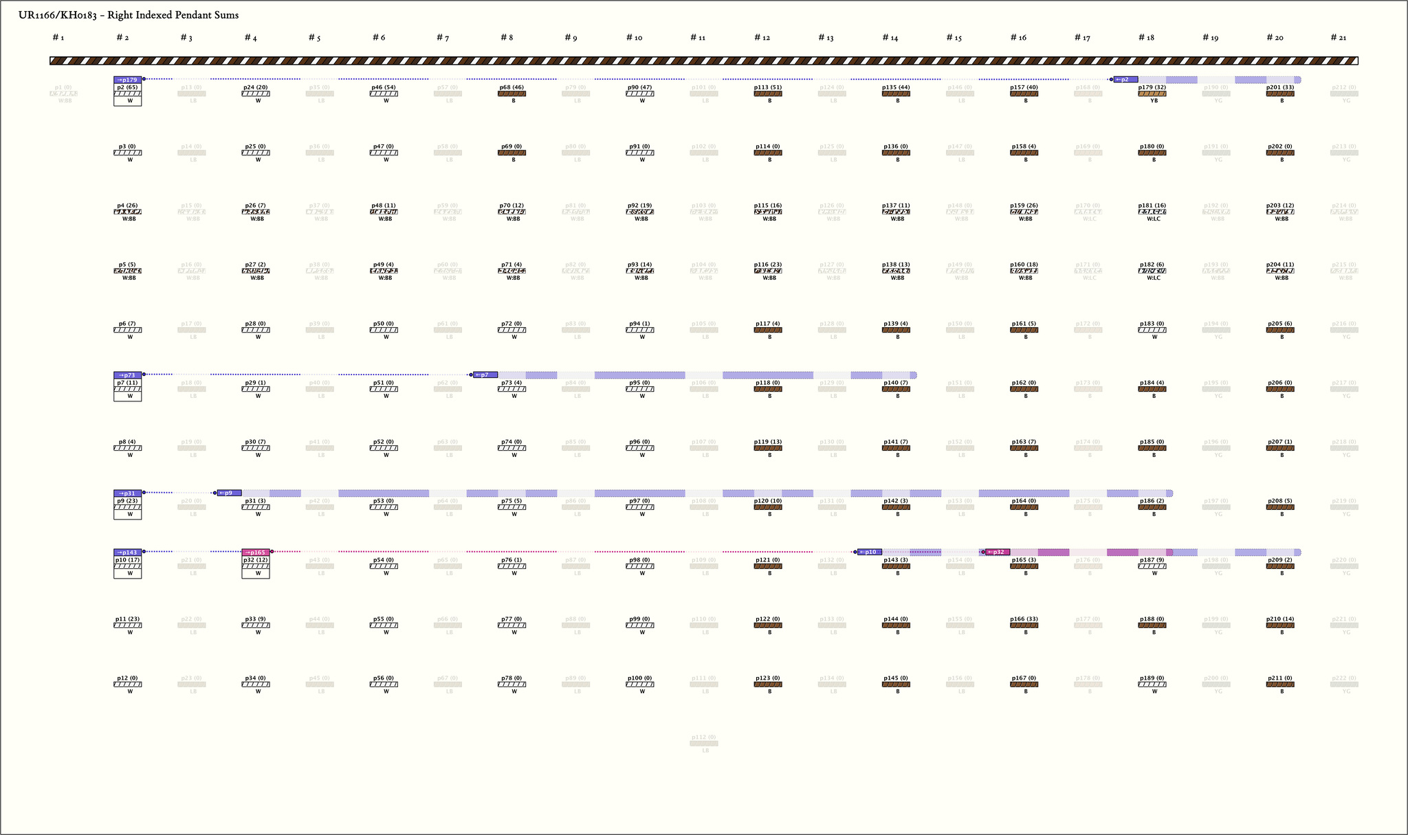 - With the exception of groups 7 and 17 (the 7 th group in each part), each group has the same patterning of colors: 2X, 2Y, 7X, Y is BB: W in all groups except groups 16 and 17 in which it is LC:W. The X varies so that the group colors alternate. In the first part (with the exception of 2 pendants in group 7), X is W in groups 1, 3, 5, 7, and 9 and it is LB in groups 2, 4, 6, 8, 10, In the second part: X is B in groups 11, 13, 15, 19; LB in 12, 14, 16; and YG in 18 and 20.