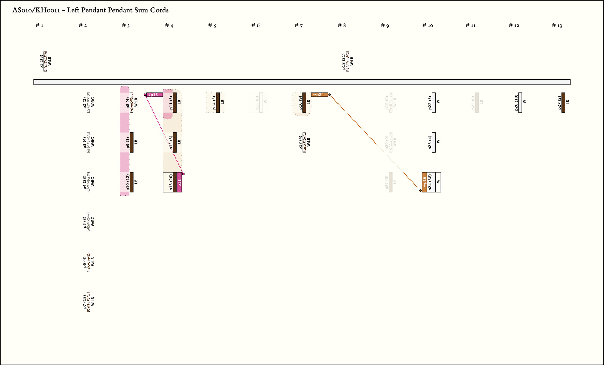 - Top cord P18 has value of 21 equaling the number of grouped cords (7 groups of 3 cords each) - excluding last two set off by main cord knot.