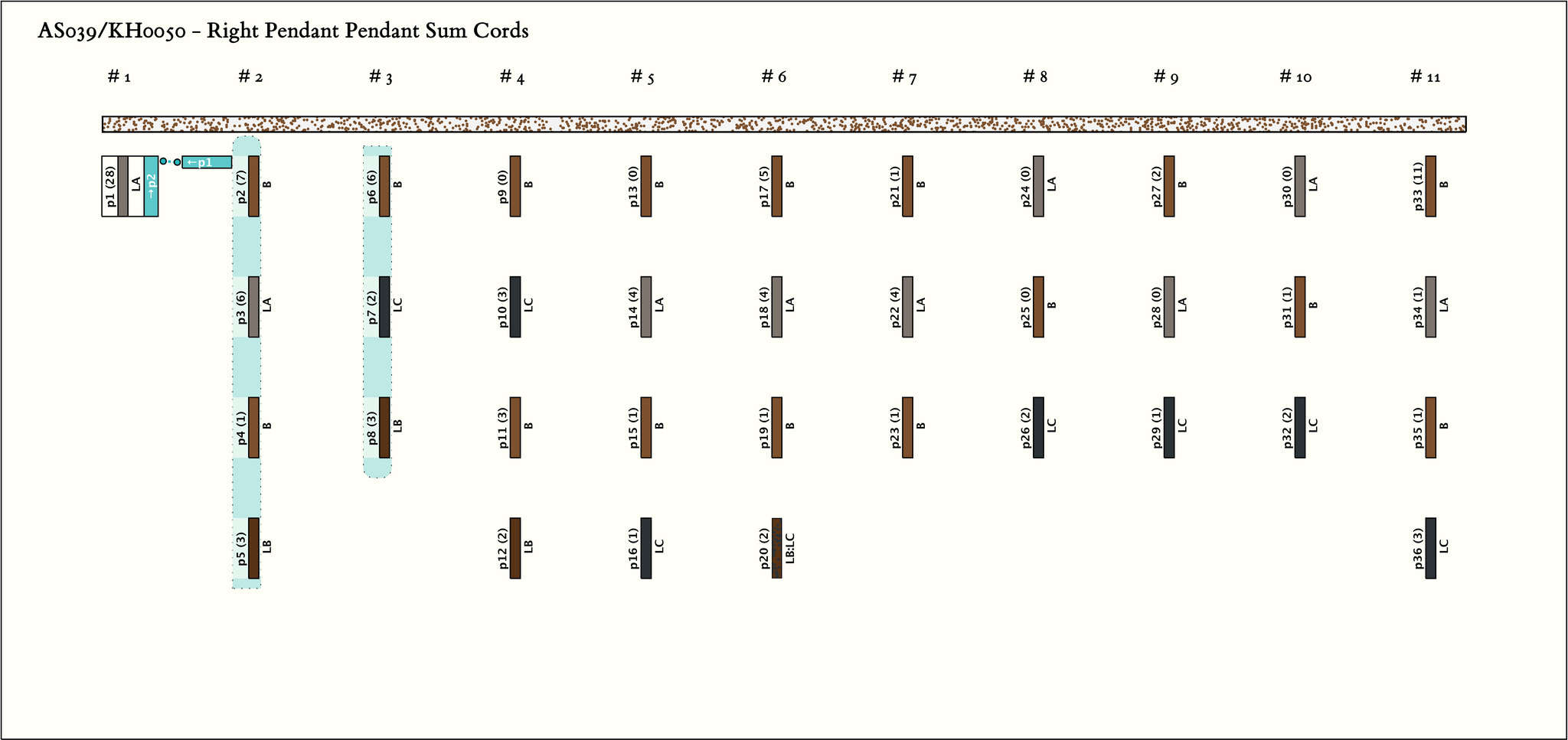 - By spacing, there is one pendant and then 10 groups of 3 or 4 cords each. Each group can be viewed as having 4 pendants. All groups have the same basic color pattern: B, LA or LC, B, LB or LC. Groups where one of these is non-existent have only 3 pendants.