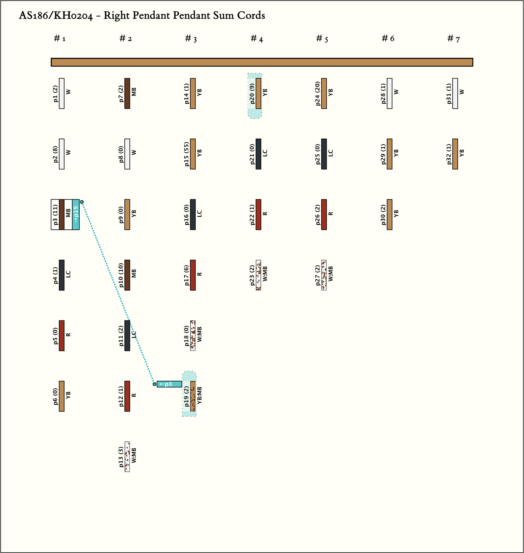 - By spacing, the khipu is separated into 3 parts of 2, 3, and 2 groups respectively. Although the groups differ in the number of pendants, within each part there is some shared color pattern: