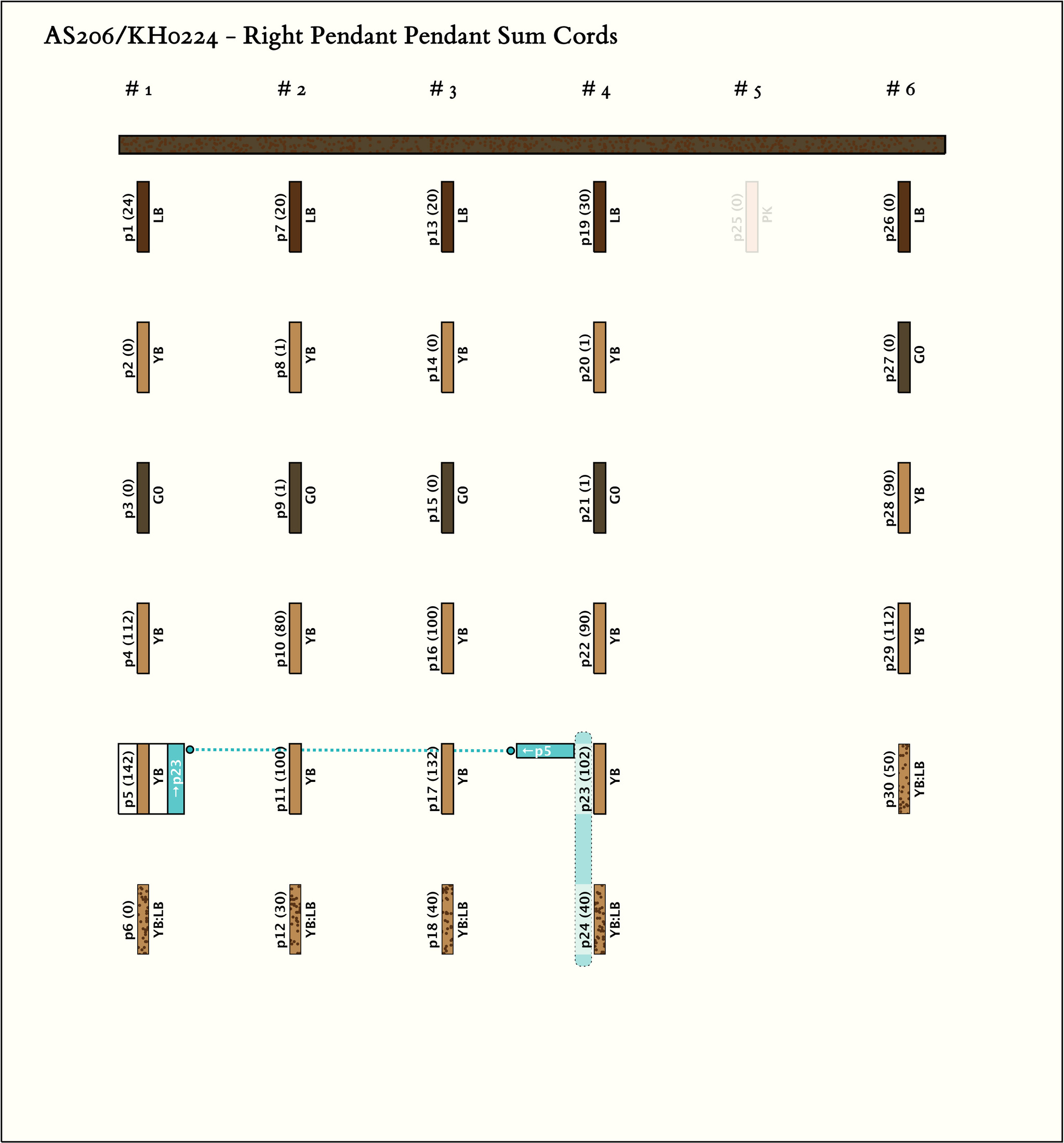 - AS206 is two fragments of the same khipu. They are not necessarily connected. The first fragment contains 4 groups of 6 pendants each and the other fragment contains 1 group of 5 pendants. All 5 groups have the same color pattern: LB, YB, GO, YB, YB, LB:YB. Where a pendant is missing it is the second pendant in the group. Where there is a subsidiary (groups 2 and 3), it is colored LB and on the last pendant in the groups.