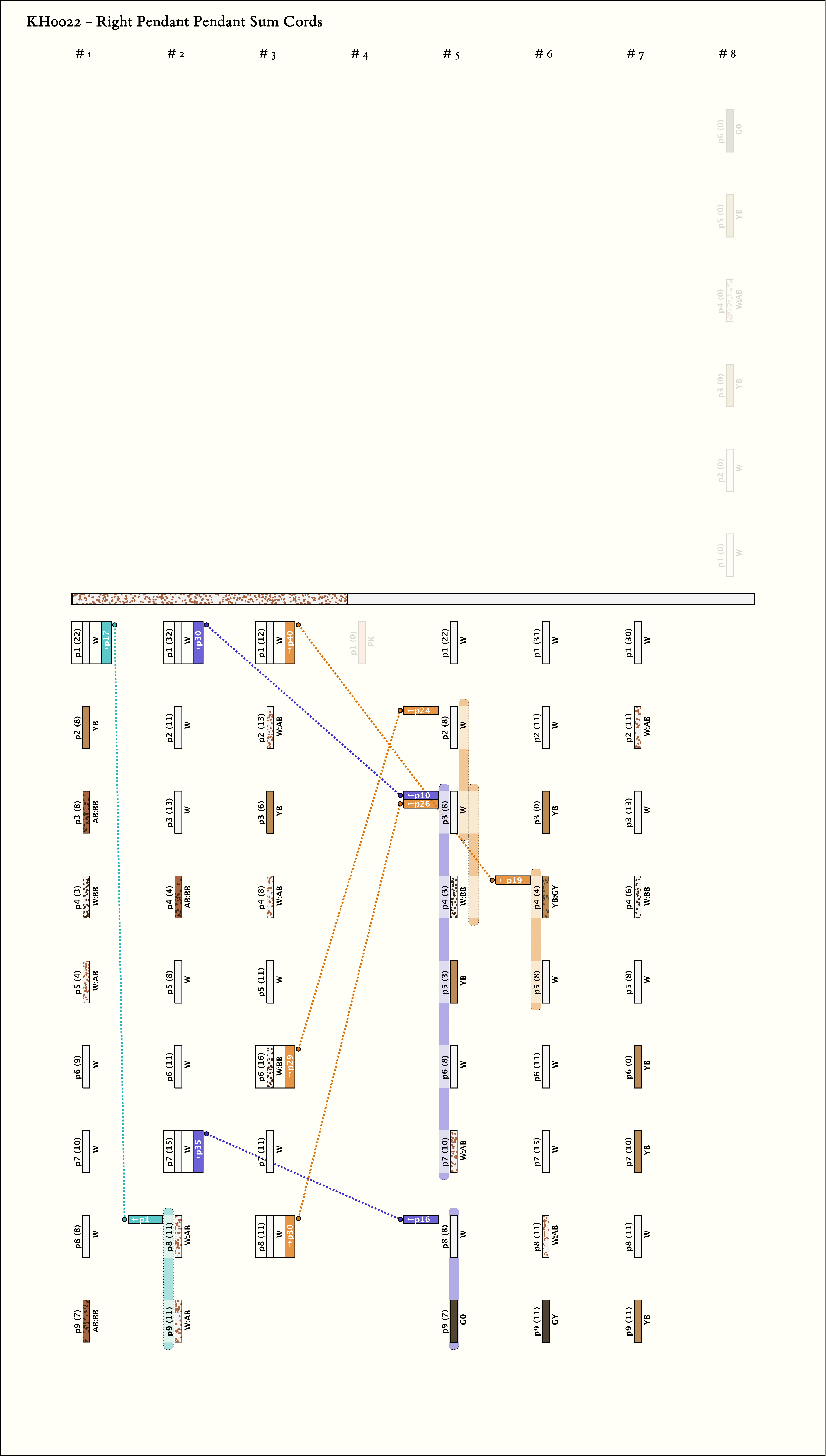 - This khipu consists of 2 main cords tied together. The main cord on each part is a different color. Part I, by spacing, contains 3 groups of 9, 9, 8 pendants and Part II, by spacing, contains 4 groups of 9, 9, 9, 6 pendants, respectively.