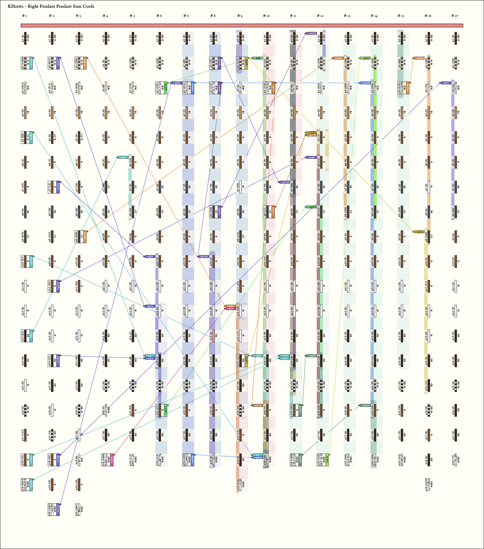 - Each group in parts 2 and 3 has the same color pattern (with the exception of position 8 in groups 4 and 5 and position 18 in group 4). The color pattern is the same as in part 1 with the systematic difference that positions 5 and 8 of the part 1 pattern do not exist. Thus, there are 18 pendants in each group in parts 2 and 3 as compared to 20 pendants in each group in part 1. Also, while the color in position 19 of the groups in part 1 are B, in parts 2 and 3, the comparable position is BD.