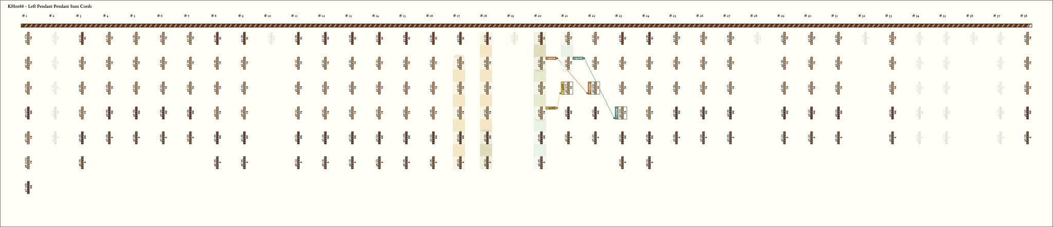 - By spacing, color pattern, and markers 1, 2, 3, the khipu is separated into 5 parts: Part I consists of 1 group of 7 pendants and Parts II, III, IV, Veach consist of 8 groups of 5 or 6 pendants each.