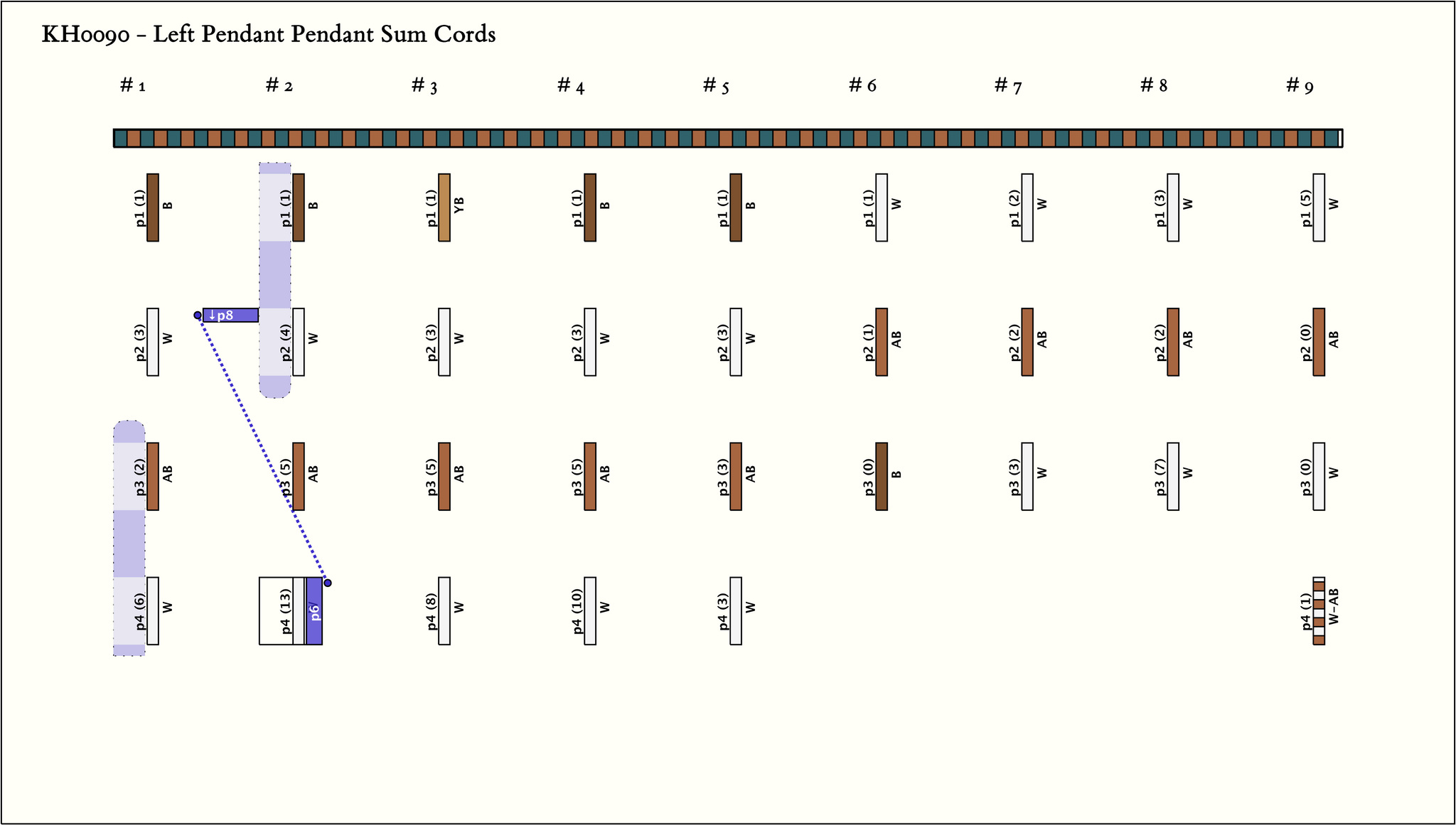 - In the first 5 groups, long knots and figure eight knots appear in two knot positions on the first 3 pendants of each group. On the 4th pendant in each group, there is the usual knot usage (single knot clusters in higher positions and long knots or figure eight knots in the units position). Where double unit values appear, the higher value is a 1 and the lower values are 0-4. The last 4 groups have no double unit knot positions.