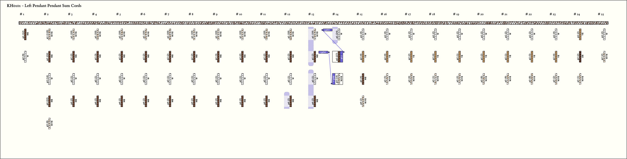 - By spacing, the khipu is separated into 25 groups. Groups 2-13 and groups 14-23 are united by values and color pattern. Group 24 is separated from group 23 by a much larger space on the main cord. Hence, the khipu can be described as in 4 parts: Part I contains 1 group of 2 pendants; Part II is groups 2-13; Part III is groups 14-23; and Part IV is groups 24-25.