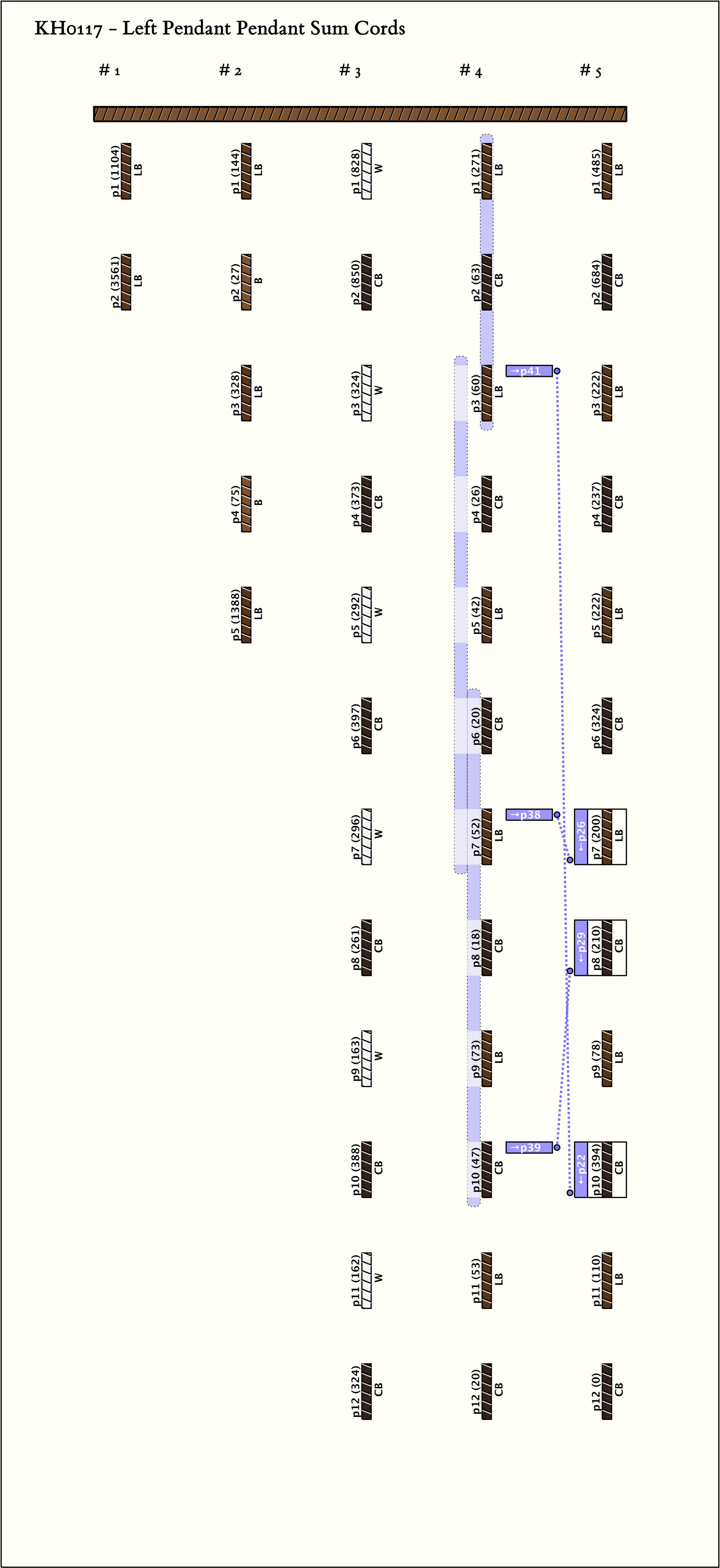 - Each group has an alternating color pattern: the pendants in group 1 alternate LB, B with all subsidiaries CB; group 2 pendants alternate W, CB; group 3 alternates LB (with a W subsidiary), CB (with a CB subsidiary); and group 4 alternates LB (with a B subsidiary), CB (with a CB subsidiary).