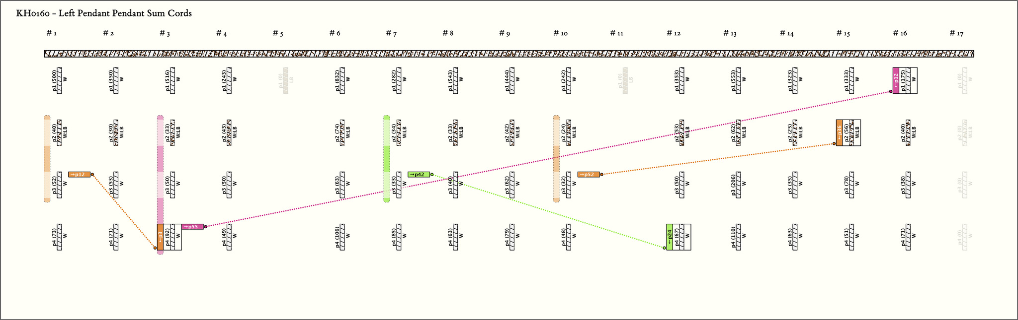 - By spacing and markers, the khipu is separated into 4 parts. The first part is 4 groups, the second and third parts are 5 groups each, and the last part is 1 group. All groups have 4 pendants with the same color pattern: W, LB:W, W, W.