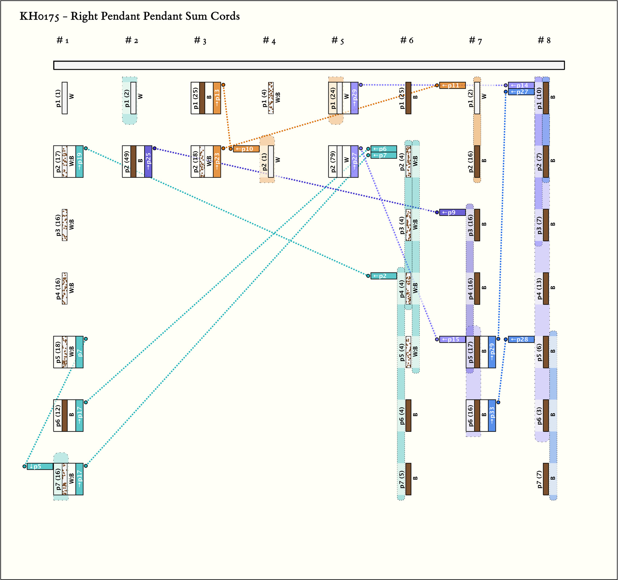 - By spacing, there are 8 groups with different numbers of pendants. There are much larger spaces on the main cord between groups 6-7 and 7-8 than there are between others. The only consistent colors are in the 3 groups with 7 pendants each (groups 1, 6, and 8). Group 8 is unified: all pendants are B. Groups 1 and 6 both have the pattern X, 4B:W, 2X where X=W in group 1 and X=B in group 6.