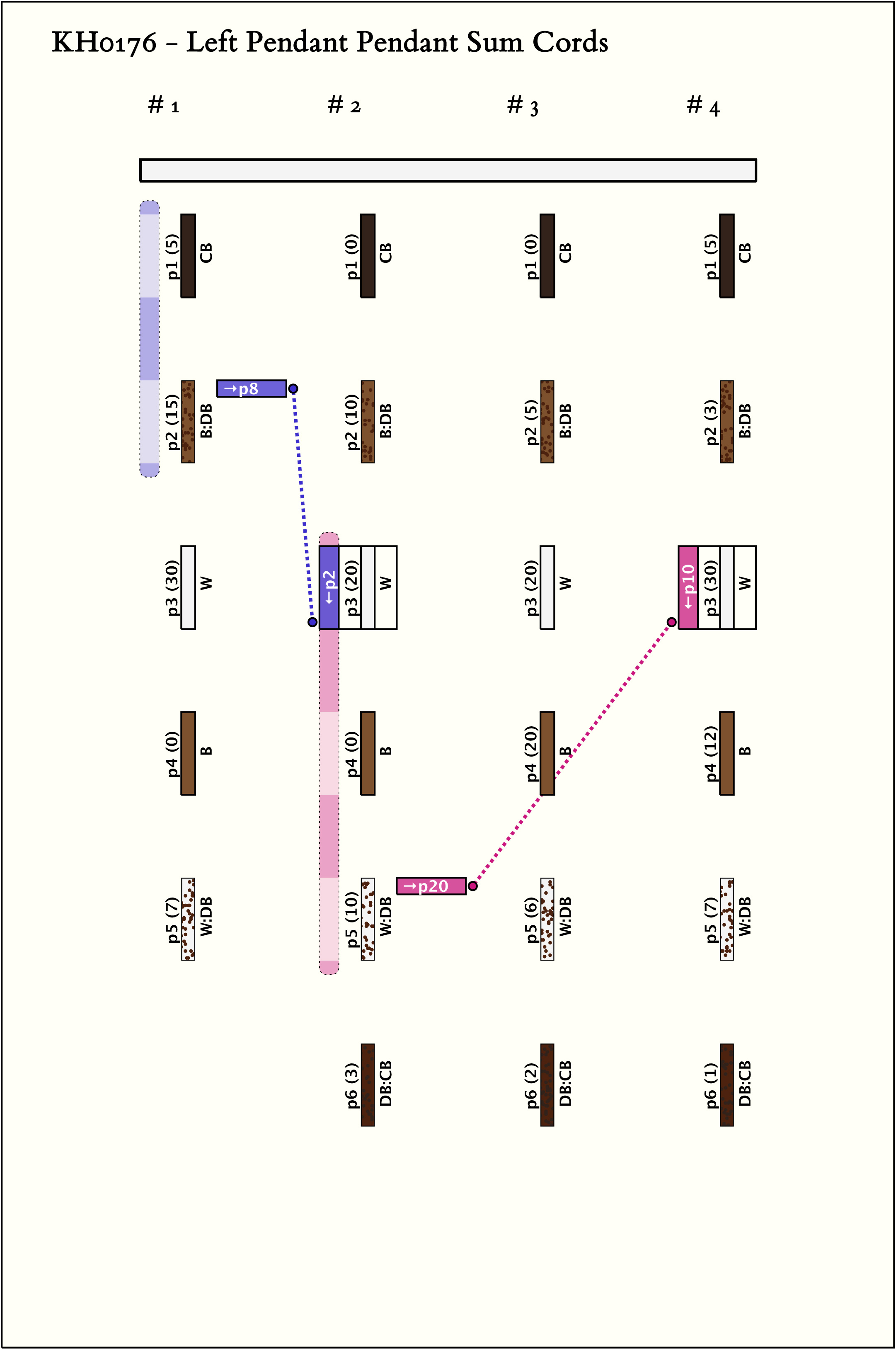 - By spacing, the khipu consists of 4 groups of 6 pendants each. Each group has the same color pattern.