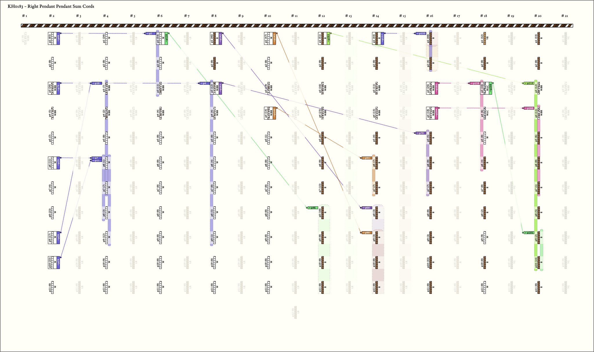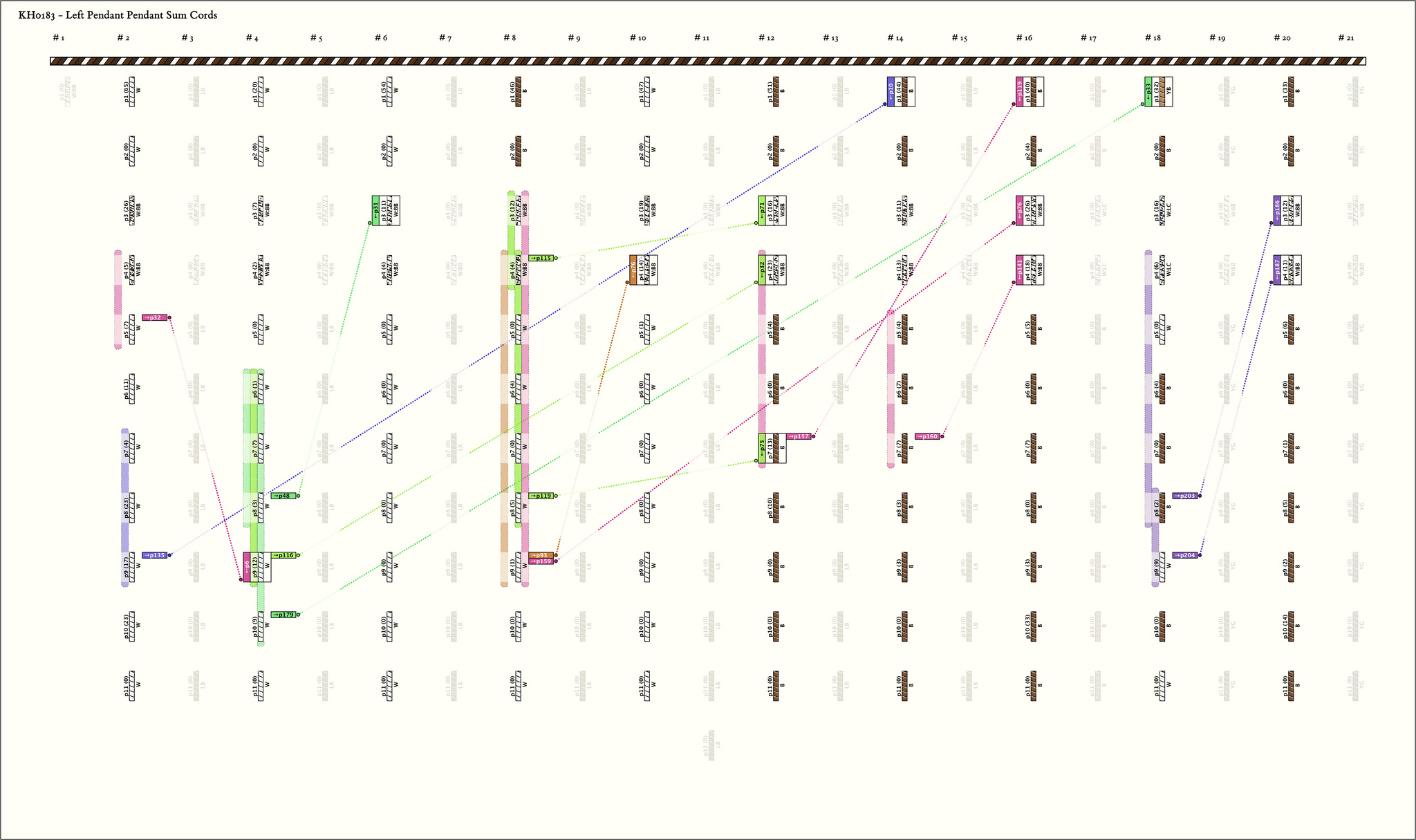 - Construction note: The twisted ends of the main cord and first cord are linked together. Cord 1 is shorter than the other pendants and bound with thread at its end. 2.Construction note: Subsidiaries attached to the first subsidiary on pendants 2, 24, 135, 157, 179, and 201 are attached in a non-standard way. They are looped around both the pendant and subsidiary to which they are connected.
