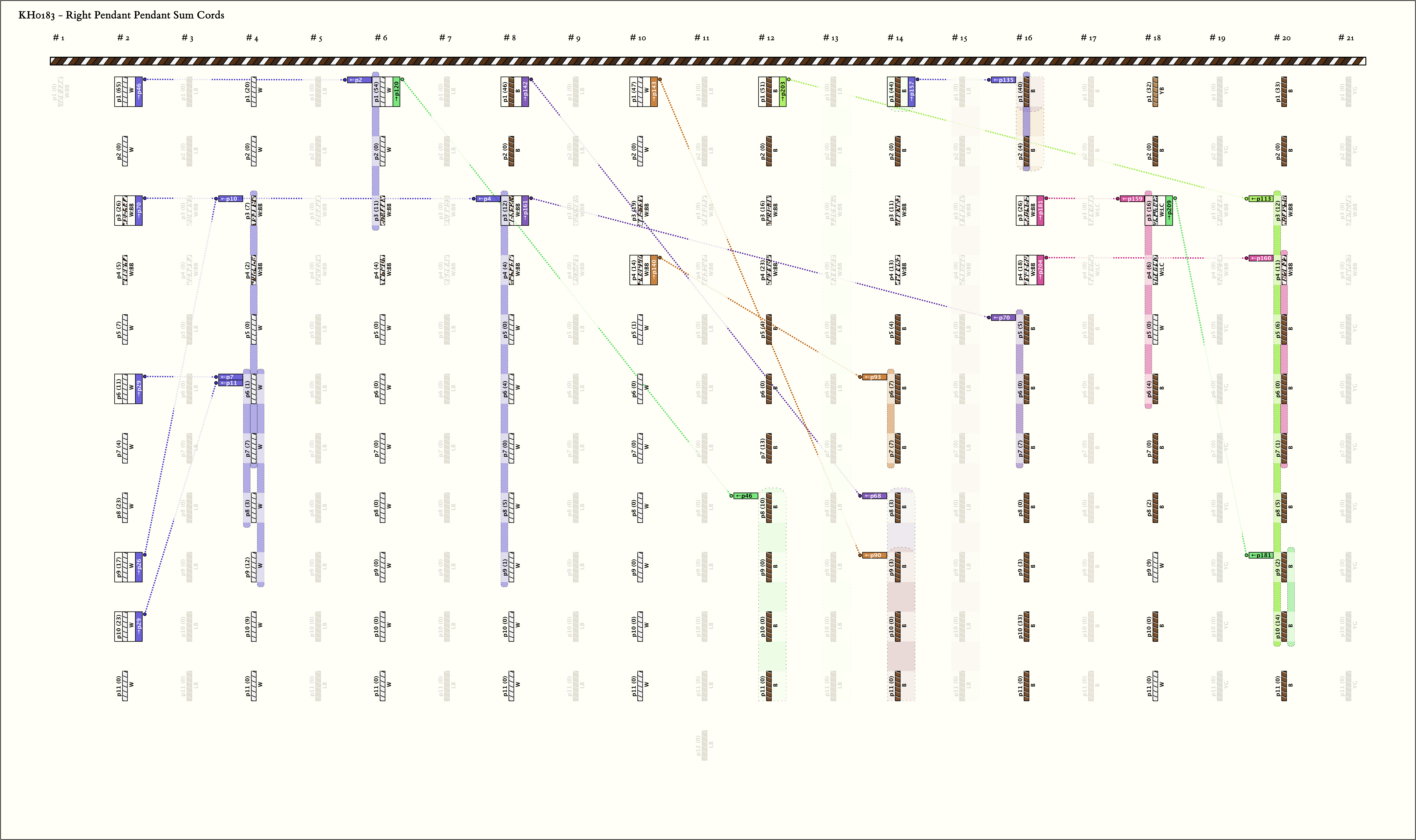 - With the exception of groups 7 and 17 (the 7 th group in each part), each group has the same patterning of colors: 2X, 2Y, 7X, Y is BB: W in all groups except groups 16 and 17 in which it is LC:W. The X varies so that the group colors alternate. In the first part (with the exception of 2 pendants in group 7), X is W in groups 1, 3, 5, 7, and 9 and it is LB in groups 2, 4, 6, 8, 10, In the second part: X is B in groups 11, 13, 15, 19; LB in 12, 14, 16; and YG in 18 and 20.