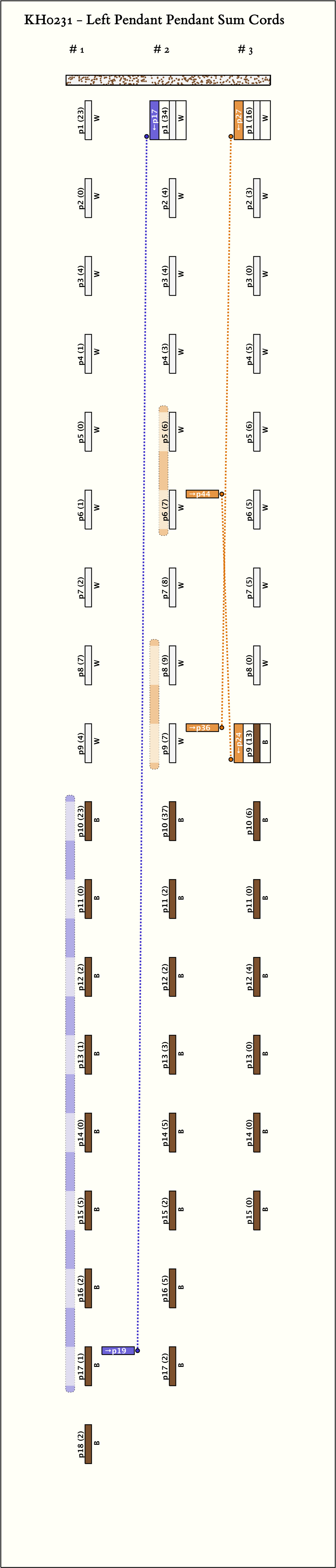 - A cord fragment was tied to the main cord just before P19. The cord color is B and it is broken at both ends. Beginning at the broken end nearest the single knots there is a space of 4.5, 3s, space of 8.5, 3L, space of 13.5, broken end. It is unlikely that the fragment is part of broken P50, P10s1, or P18s1 because the knots would not be aligned with the others in the group. The fragment's value (33) would make it unlikely to be part of broken P48 or the pendant that may be missing just after P35. These would be expected to have values less than 10. When the fragment was tied to the main cord is unknown but it does not appear to have been done recently.