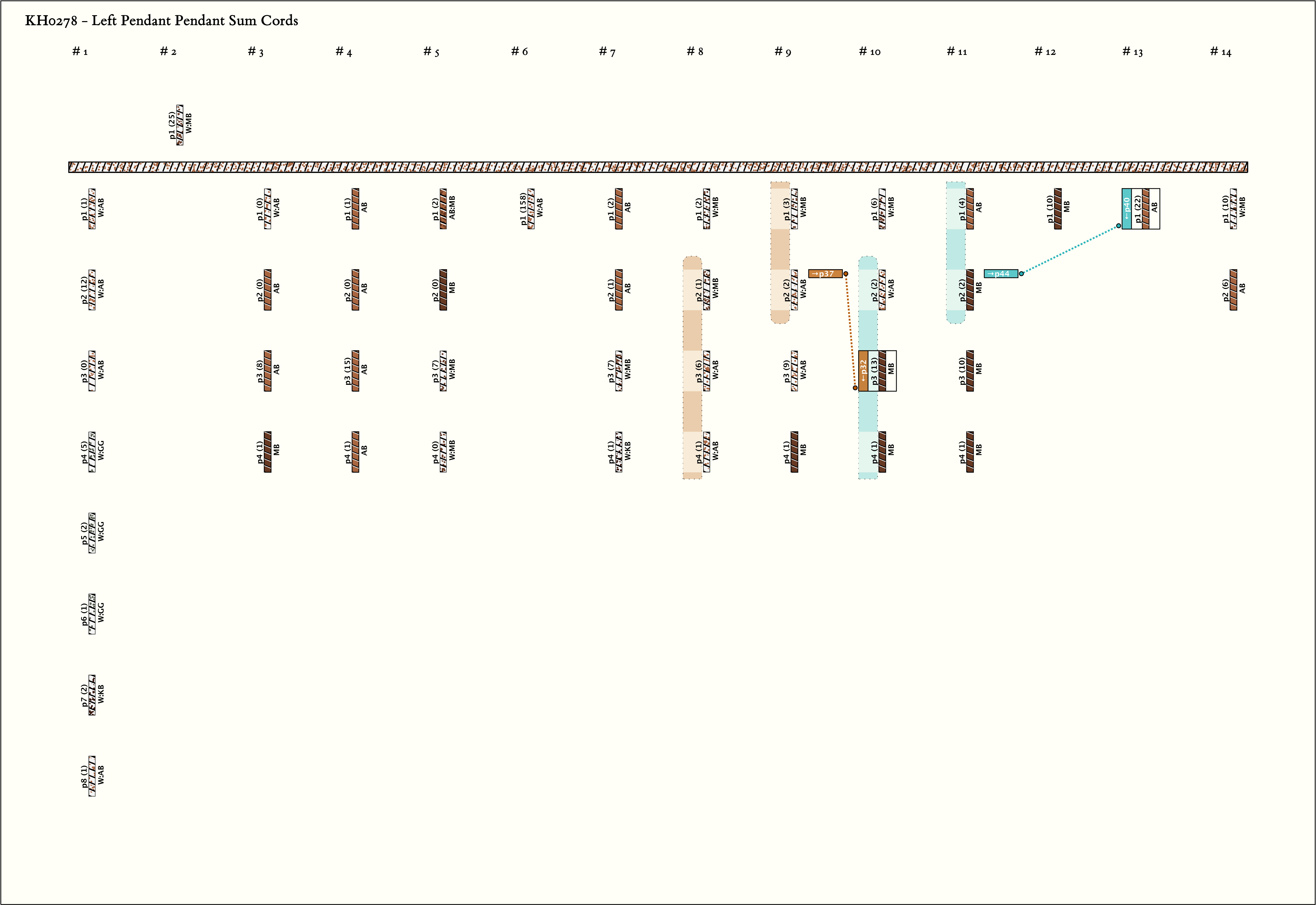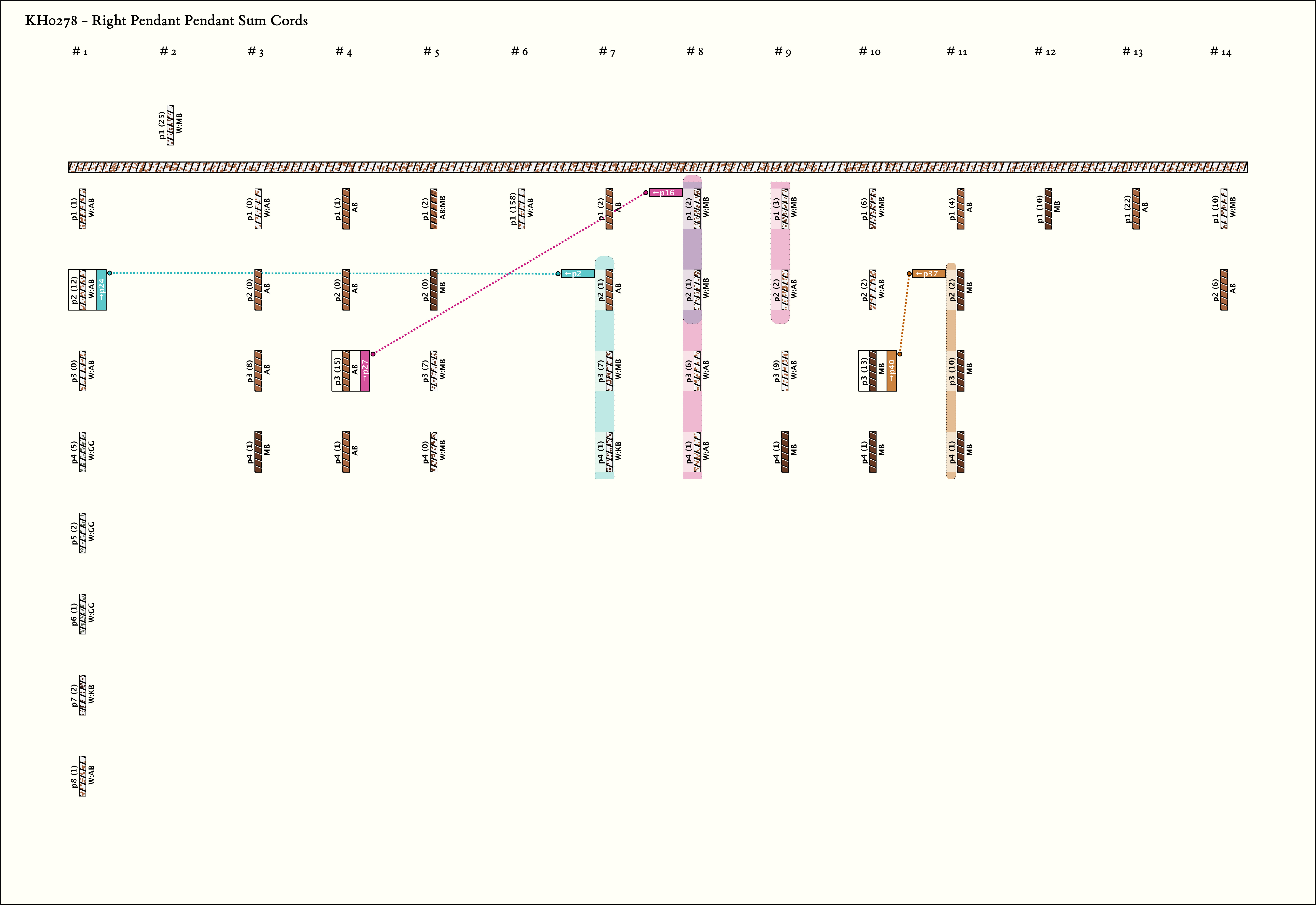 1. Pendant 21 has its 6 subsidiaries attached through the doubled end. The string is tied in a single knot about the primary cord. Measurements are taken from the doubled end up to the knotted end. See Urton's notes for picture.