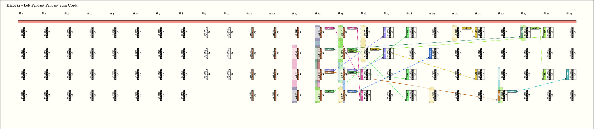 This khipu has been reconstructed using information from Jon Clindaniel's DASH thesis notes at Harvard. Cord cluster information is missing and has been defaulted to one cord per cluster.