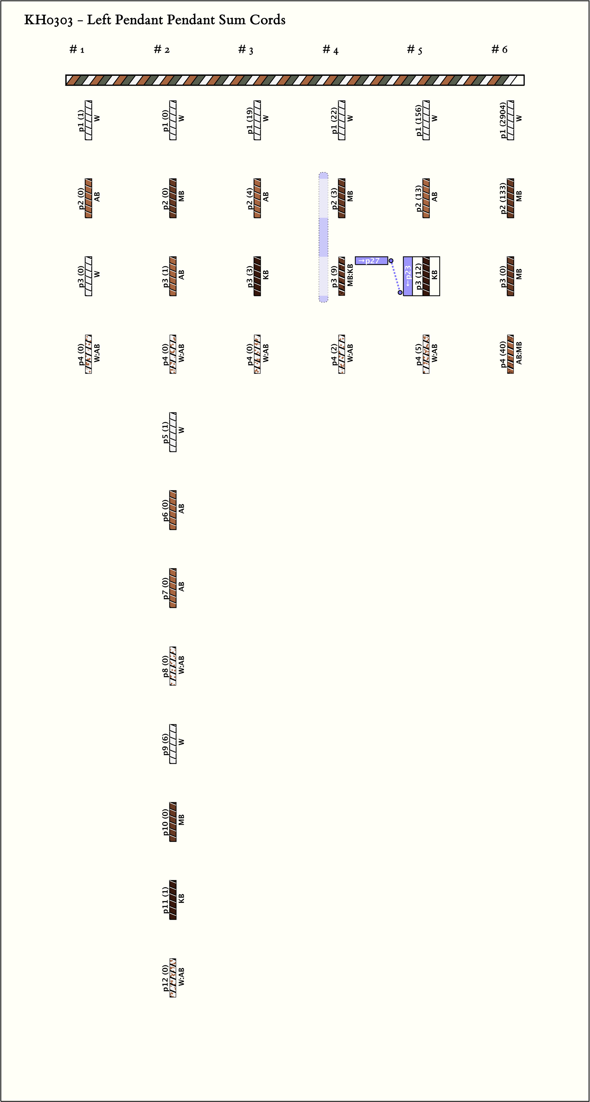 UR66 was rolled together with UR67. Pendants facing away, khipus unroll so that doubled end of primary cords are on the left; 66 is on top. Roll up left to right, S spiral.