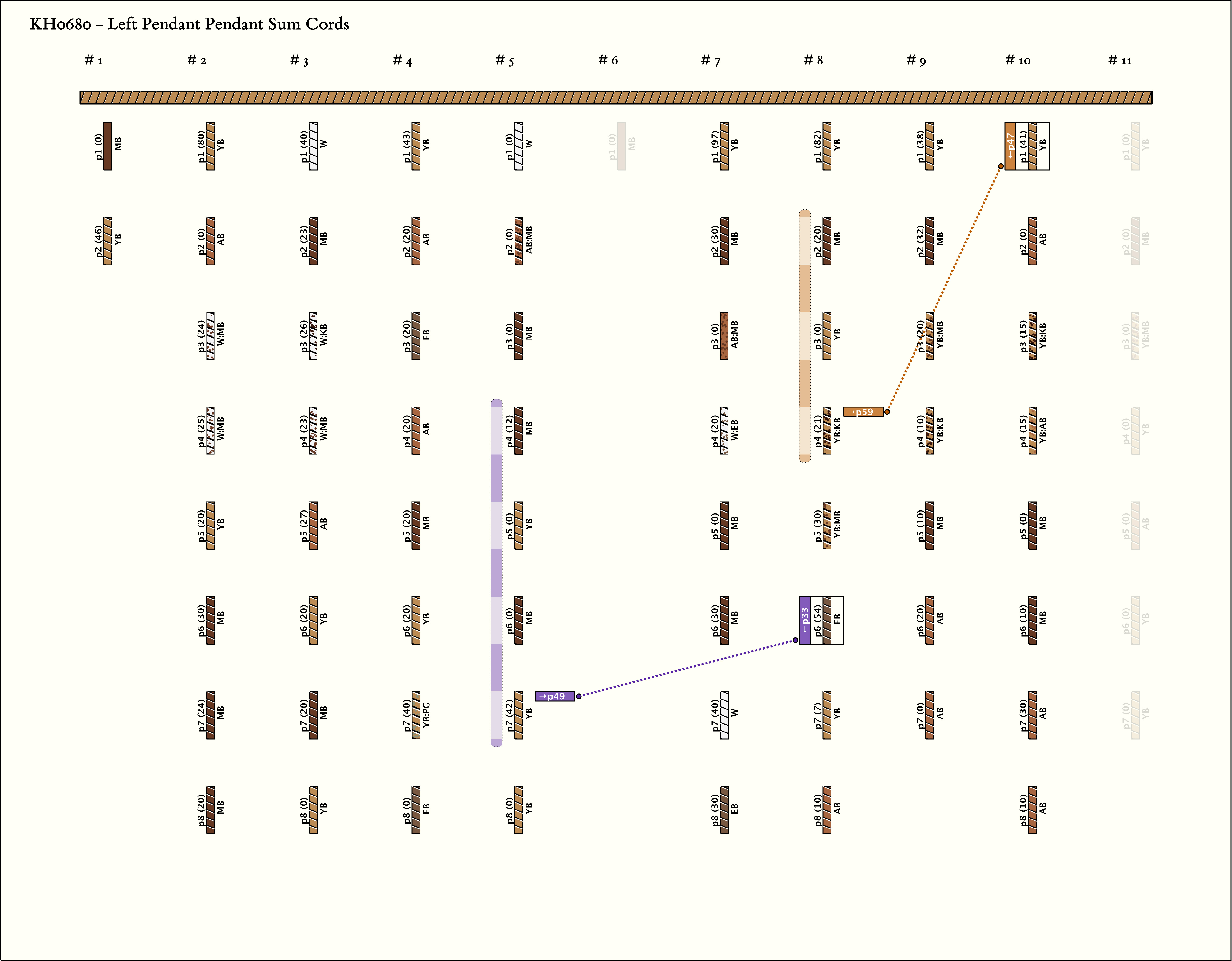 Museum Description: One of four khipus in the museum collections (three of which are on display). Displayed flat in the exhibit, in same configuration over the past several decades (lying ~flat, slight angle for viewing in waist-high glass display case in the "Kulturen der Welt" exhibit on the third (top) floor of the museum). Mounted on a cloth board with KH0680 (Gaffron collection). The khipu has a medium-thickness, solid-color primary cord. A fully detached piece of the primary cord's dangling end is displayed above the pendant section of the primary cord. An additional fragment of the primary cord is attached to the backing board near the top right corner of mounting. It appears that the portion of primary cord with associated pendants is fully preserved (as the detached section of primary cord does not have any associated pendants).