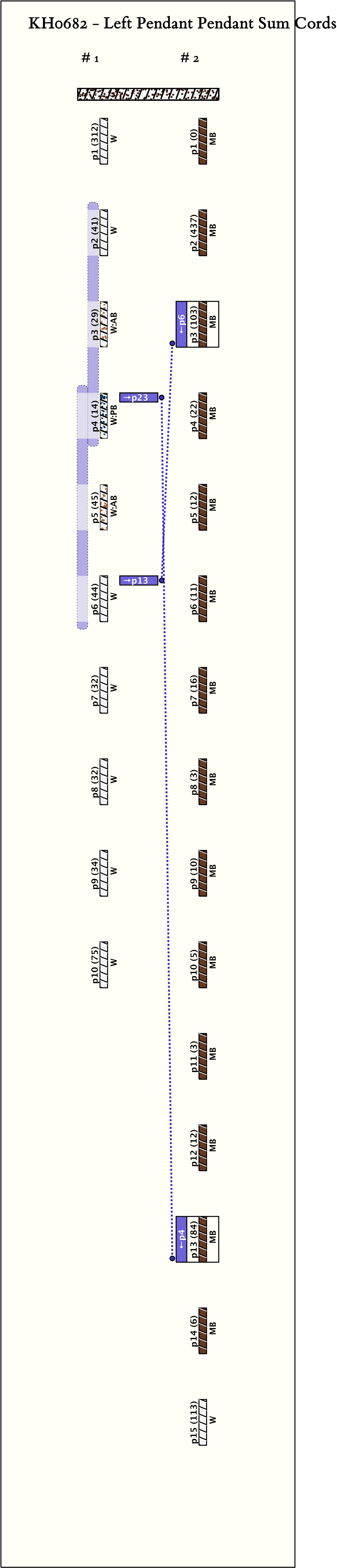 This khipu is one of 10 sewn onto a black fabric backing. There is no evidence to indicate that the 10 khipus were originally part of the same artifact, and they are thus recorded separately. The tarp itself is inventoried under IVc.366.03; I append the letters A-J to signify which khipu is referenced in the data, since many individual detached cords are sewn on as well, but are not considered khipus (for the purposes of this catalog) since they lack their original primary cord. The tarp corresponds to drawings attributed to Erland Nordenskiöld, an early Swedish archaeologist and anthropologist who was a head curator of the Ethnographic Museum in Gothenburg.