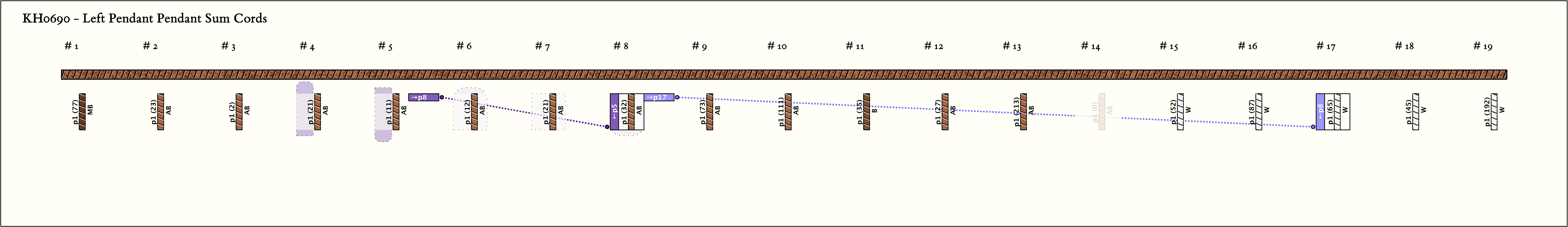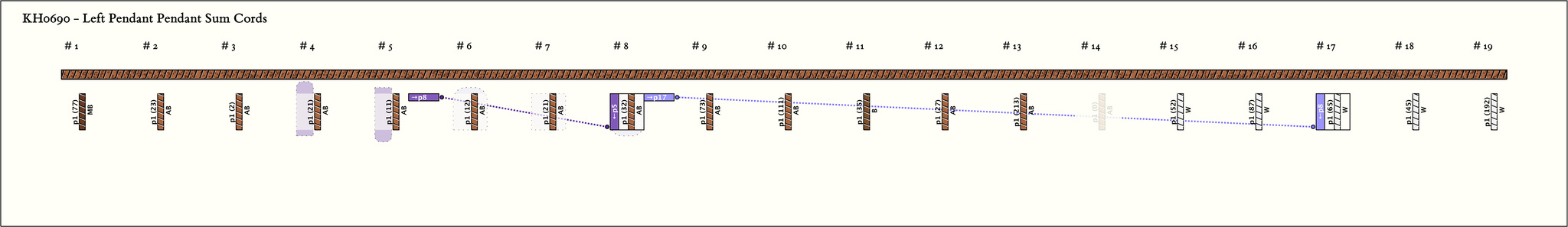 Moderate size khipu fragment with a tenuous and fragile primary cord. Given the looseness of the attachments, there is some question as to whether the cords are all original to this khipu. It is clear that the first "pendant" (as viewed from the left as mounted; a cord with a substantial subsidiary bundle) was tied on later with thread near the beginning of the fragment, although this detached pendant is not original to the fragment it is associated with. This spurious pendant is omitted from the data table.
