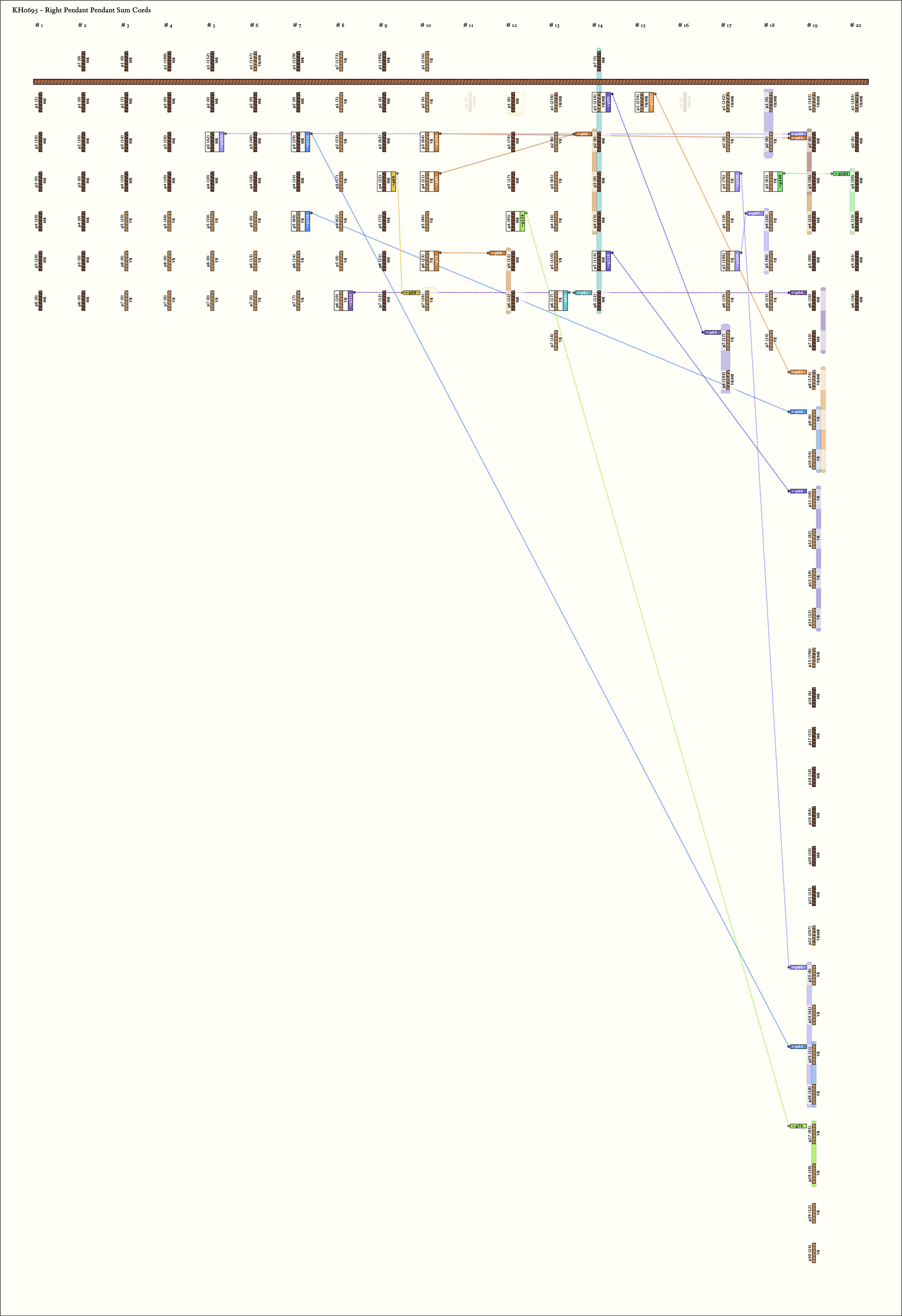 Notes: ***Read from left to right as mounted. Note that this khipu consists of two primary cords tied together. Primary cord 1 has one string attached to it and was recorded separately. This is the record for primary cord 2.