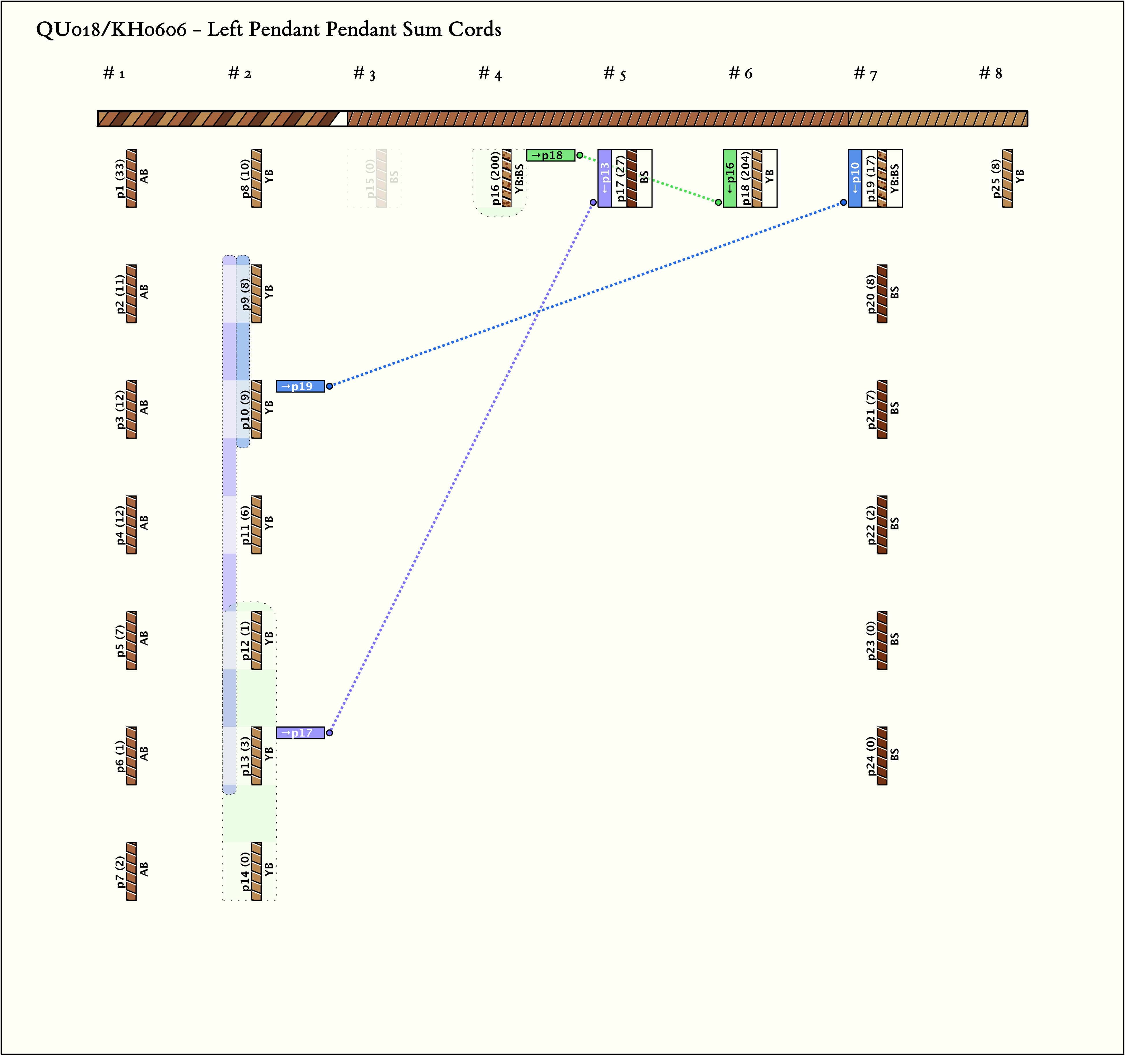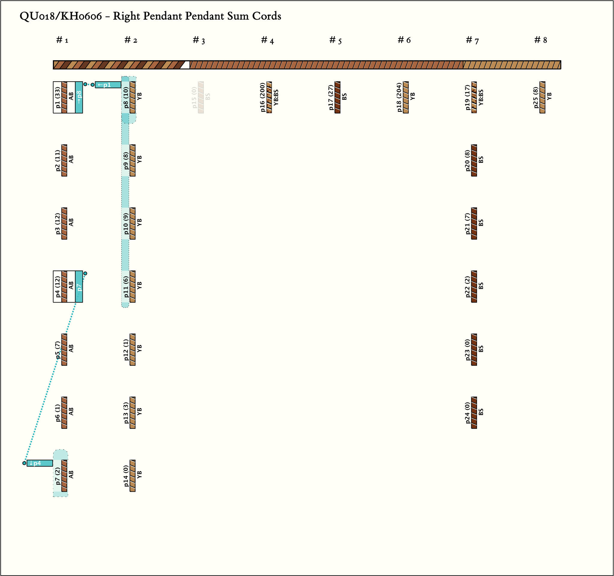 Main A - .6cm diameter, 26.5 long not counting wrapped up, knotted up pieces. Lt br/ch br/lt tn, S-ply. Plied end is tied in a single Z knot, other end knoted off. Is wrapped twice around Main B and knotted through itself. 3 pendants emerge from this knot (one doesnt seem to be attached anymore).