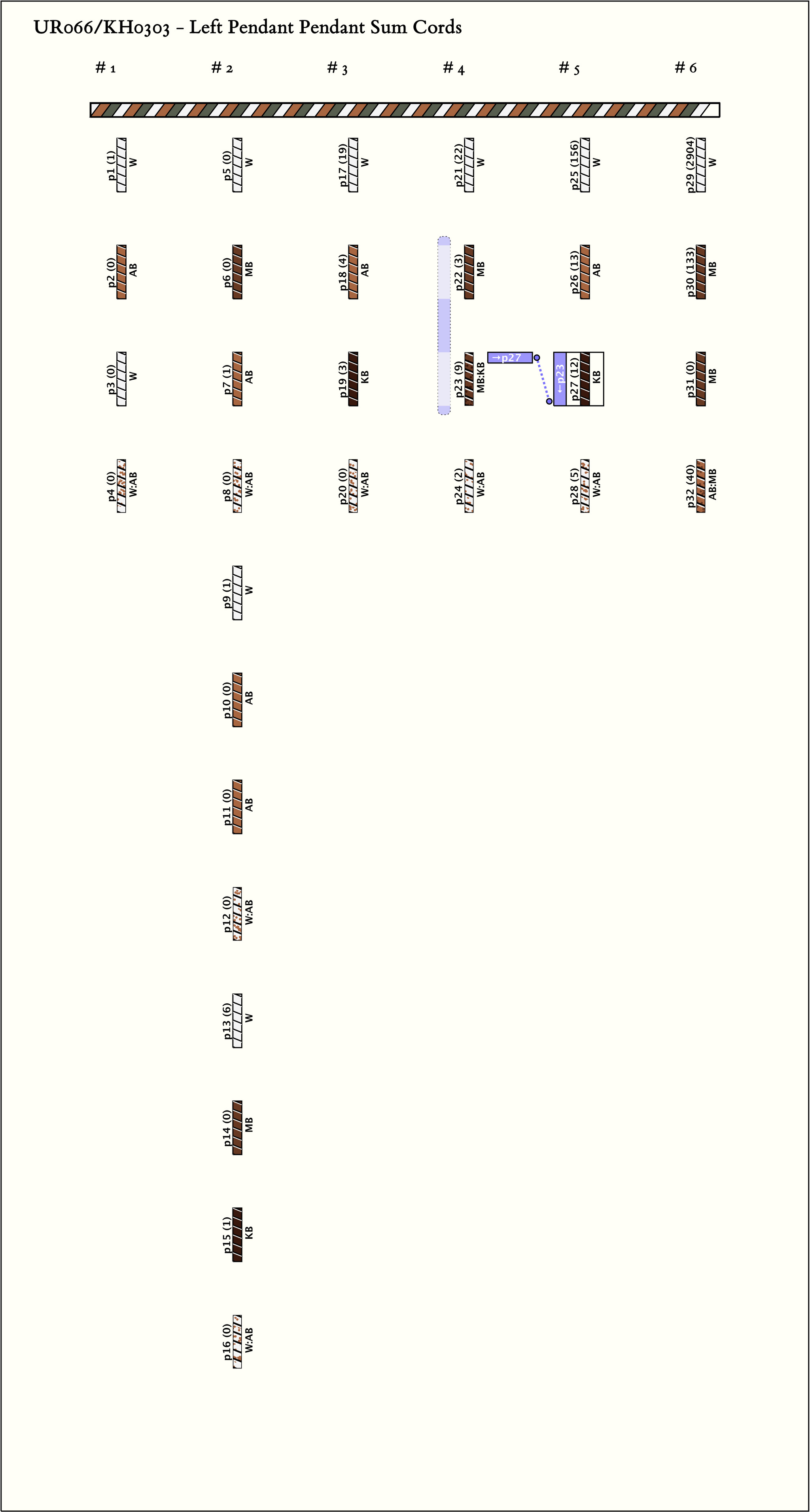 UR66 was rolled together with UR67. Pendants facing away, khipus unroll so that doubled end of primary cords are on the left; 66 is on top. Roll up left to right, S spiral.