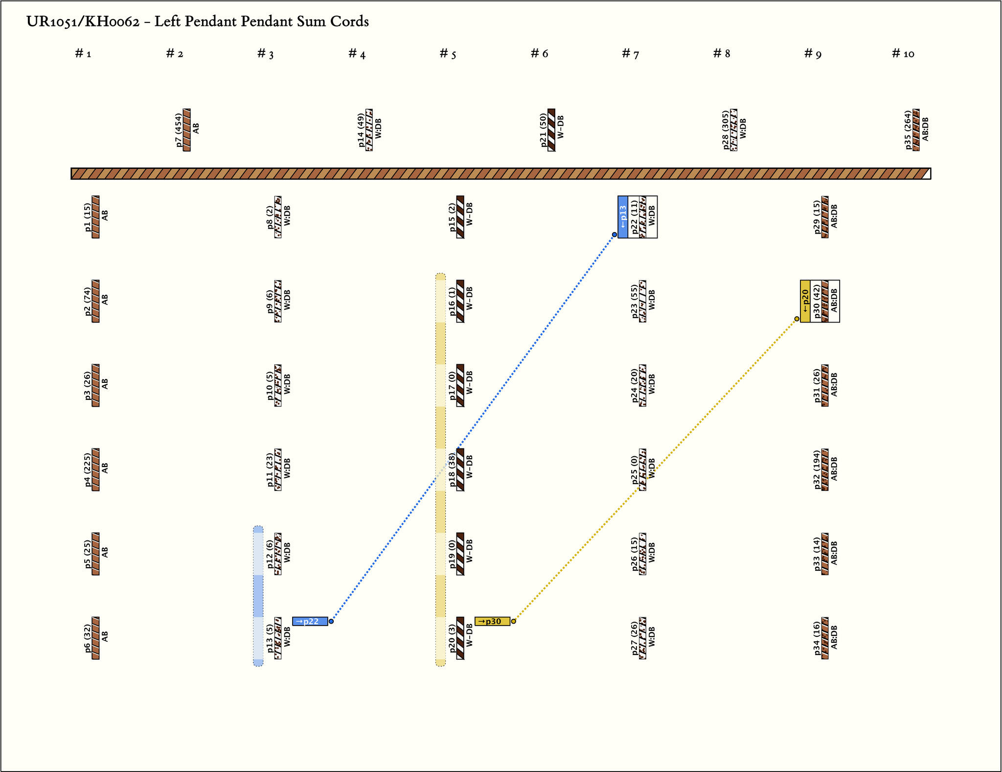 - The values on the top cords are not equal to the sums of the pendants in the group. Two are more than the group sums, 1 is less, and 2 cannot be compared due to breakage.