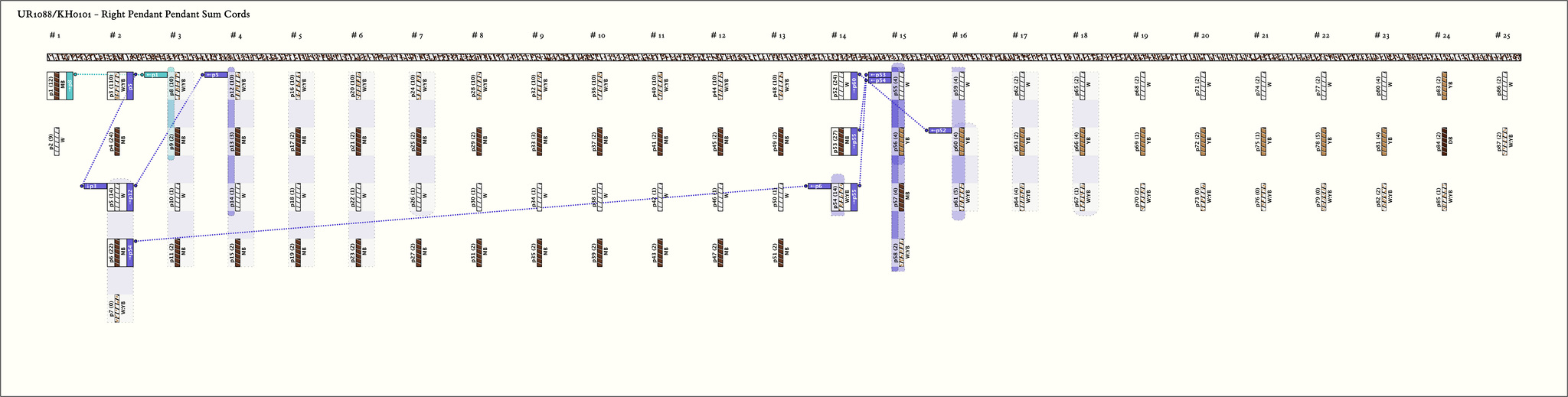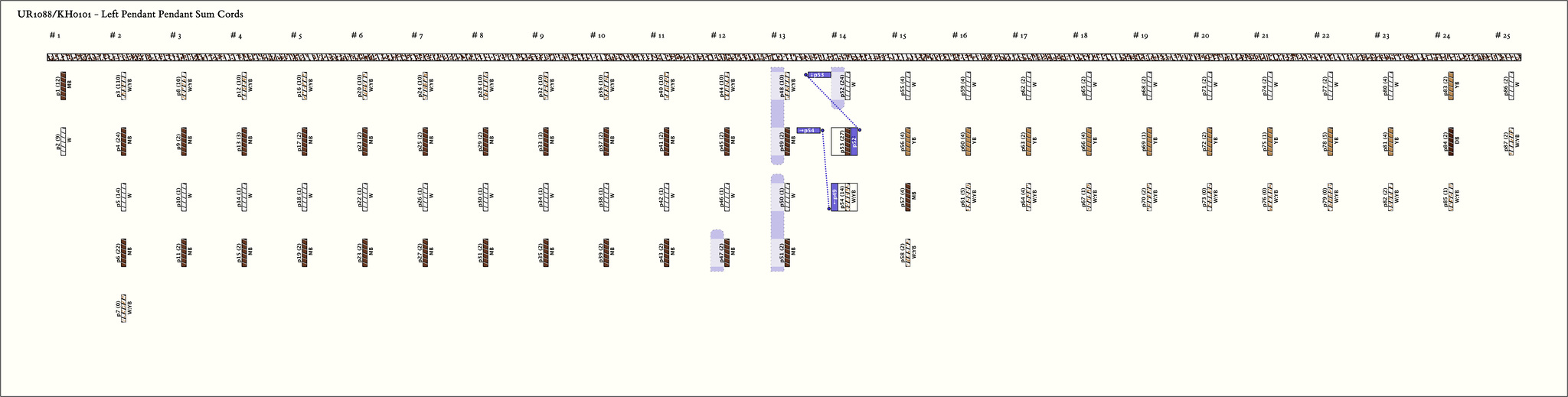 - By spacing, the khipu is separated into 25 groups. Groups 2-13 and groups 14-23 are united by values and color pattern. Group 24 is separated from group 23 by a much larger space on the main cord. Hence, the khipu can be described as in 4 parts: Part I contains 1 group of 2 pendants; Part II is groups 2-13; Part III is groups 14-23; and Part IV is groups 24-25.